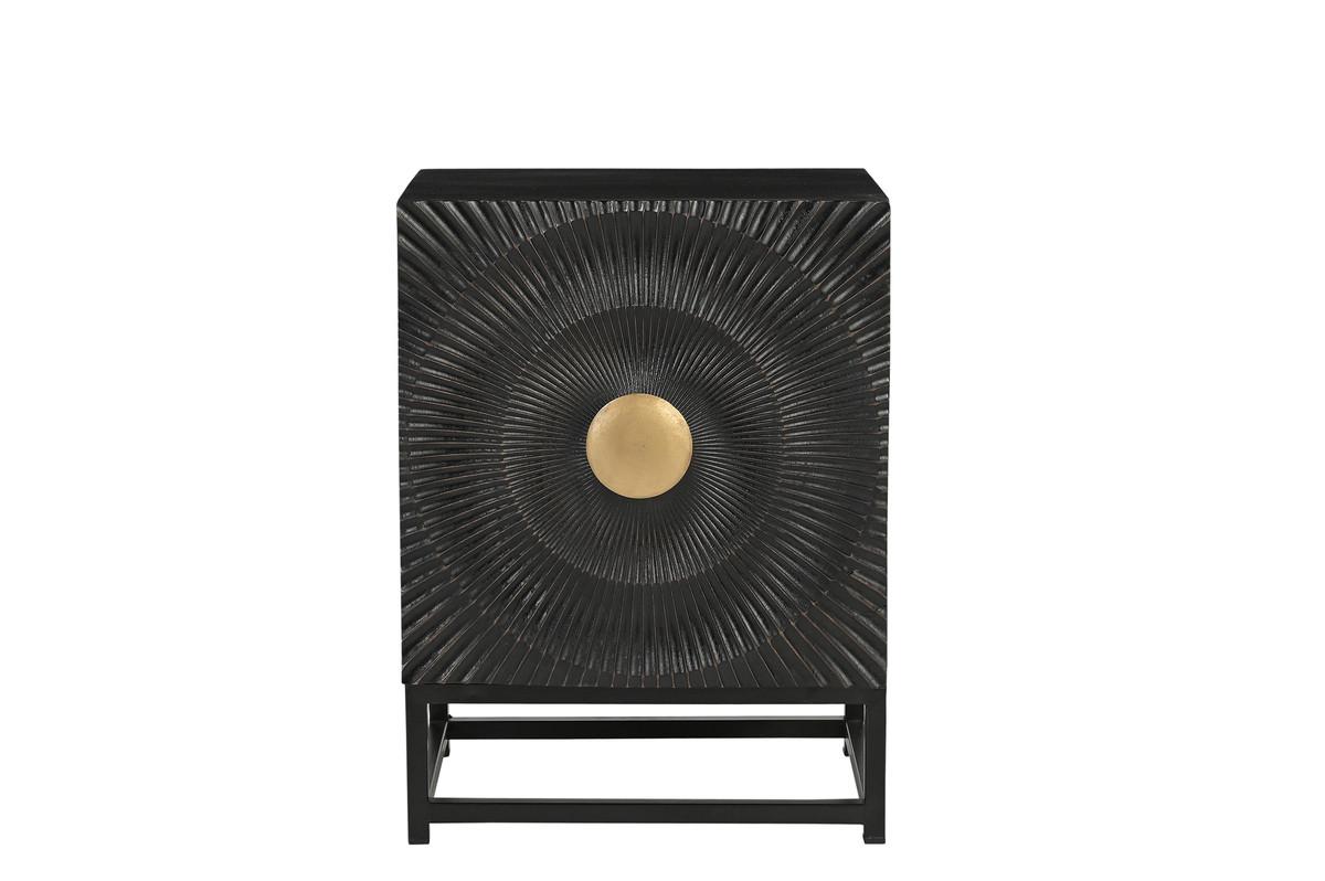La commode de nuit de la série Onyx est un chef-d'œuvre d'élégance et de fonctionnalité. Fabriquée en bois de manguier noir massif et dotée d'une poignée en métal doré, cette commode allie une qualité de premier ordre à un design exquis. Le motif sculpté marquant sur la porte n'attire pas seulement le regard, il souligne également le savoir-faire artisanal qui se cache dans chaque détail de ce meuble. Le cadre métallique noir est robuste mais élégant, ce qui confère à la commode de nuit un caractère moderne et flottant et offre une mise en valeur visuelle même dans les petites pièces. Un grand compartiment derrière la porte artistiquement travaillée offre suffisamment d'espace de rangement pour tout ce dont vous avez besoin à portée de main du lit. Cette commode de nuit Onyx est le choix parfait pour tous ceux qui souhaitent enrichir leur chambre à coucher d'un meuble fonctionnel qui fait également office d'élément décoratif stylé.