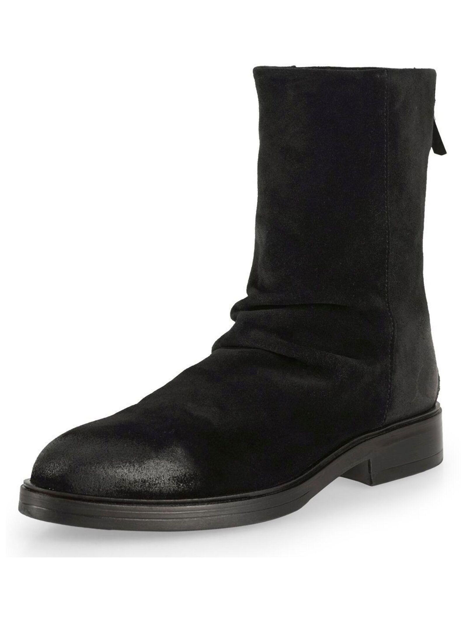 Bottes PAROS E046 en daim avec une fermeture à glissière à l'arrière pour faciliter le port, avec un talon bas et un détail de plis à l'avant. Ces bottes allient style et fonctionnalité pour un usage quotidien. Obermaterial: Suède Innenmaterial: Textile Decksohle: Cuir Laufsohle: Gomme