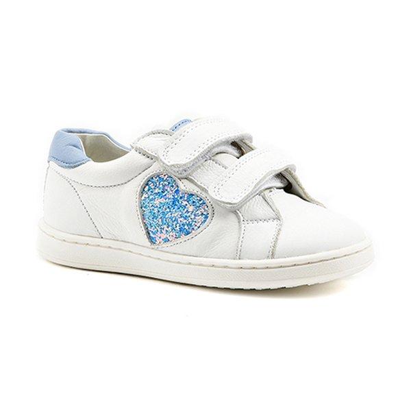 Ces baskets basses arborent un charmant motif de cœur à paillettes sur le côté, ajoutant une touche ludique à la silhouette blanche classique. Les chaussures sont conçues avec deux sangles auto-agrippantes pour une fermeture facile et sécurisée, les rendant pratiques pour un usage quotidien. Un accent bleu clair sur le talon offre un contraste subtil.