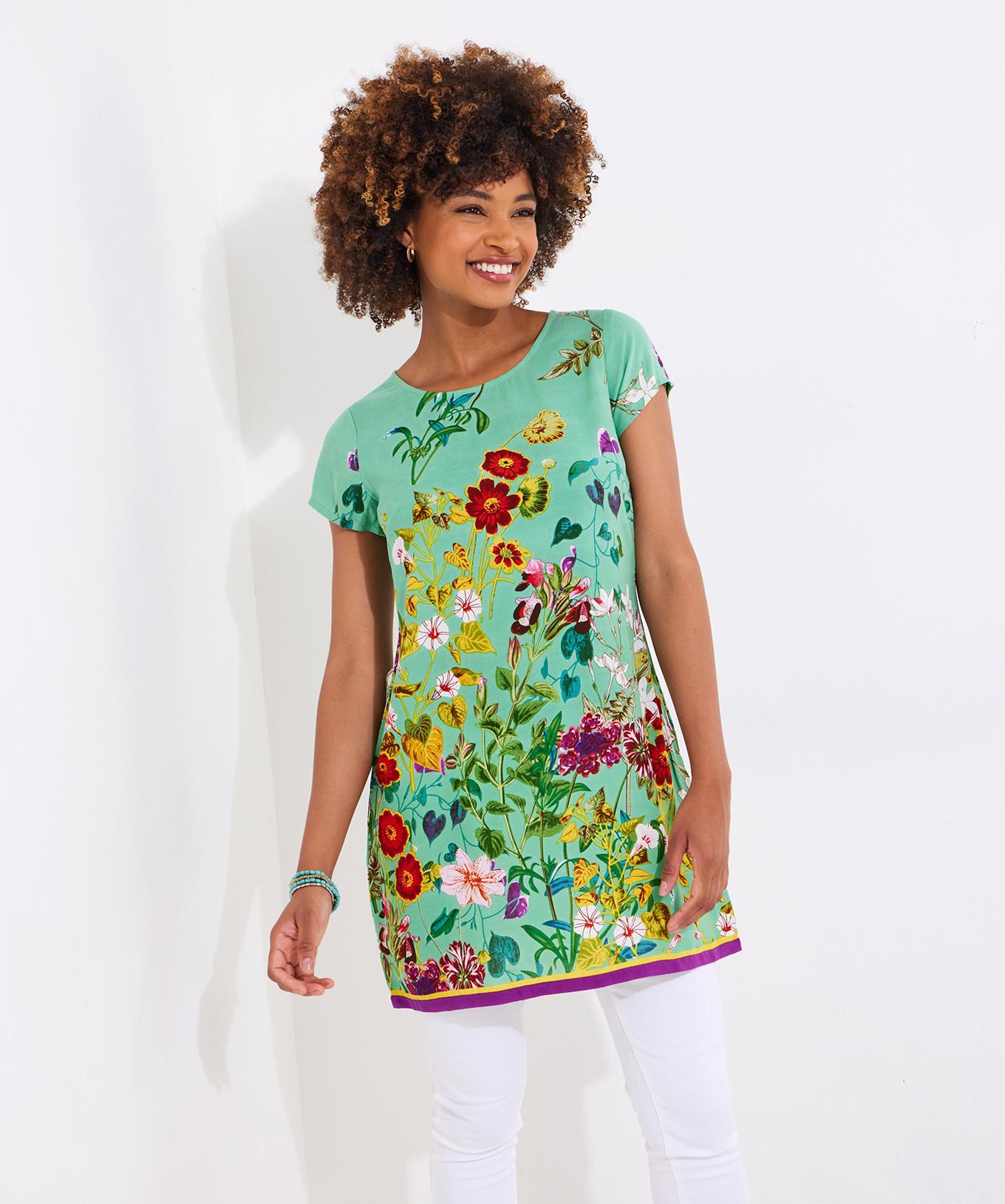 Cette tunique florale présente un col rond et des manches courtes, offrant une option confortable et élégante pour diverses occasions. Le motif floral éclatant ajoute une touche de charme inspirée de la nature au design.