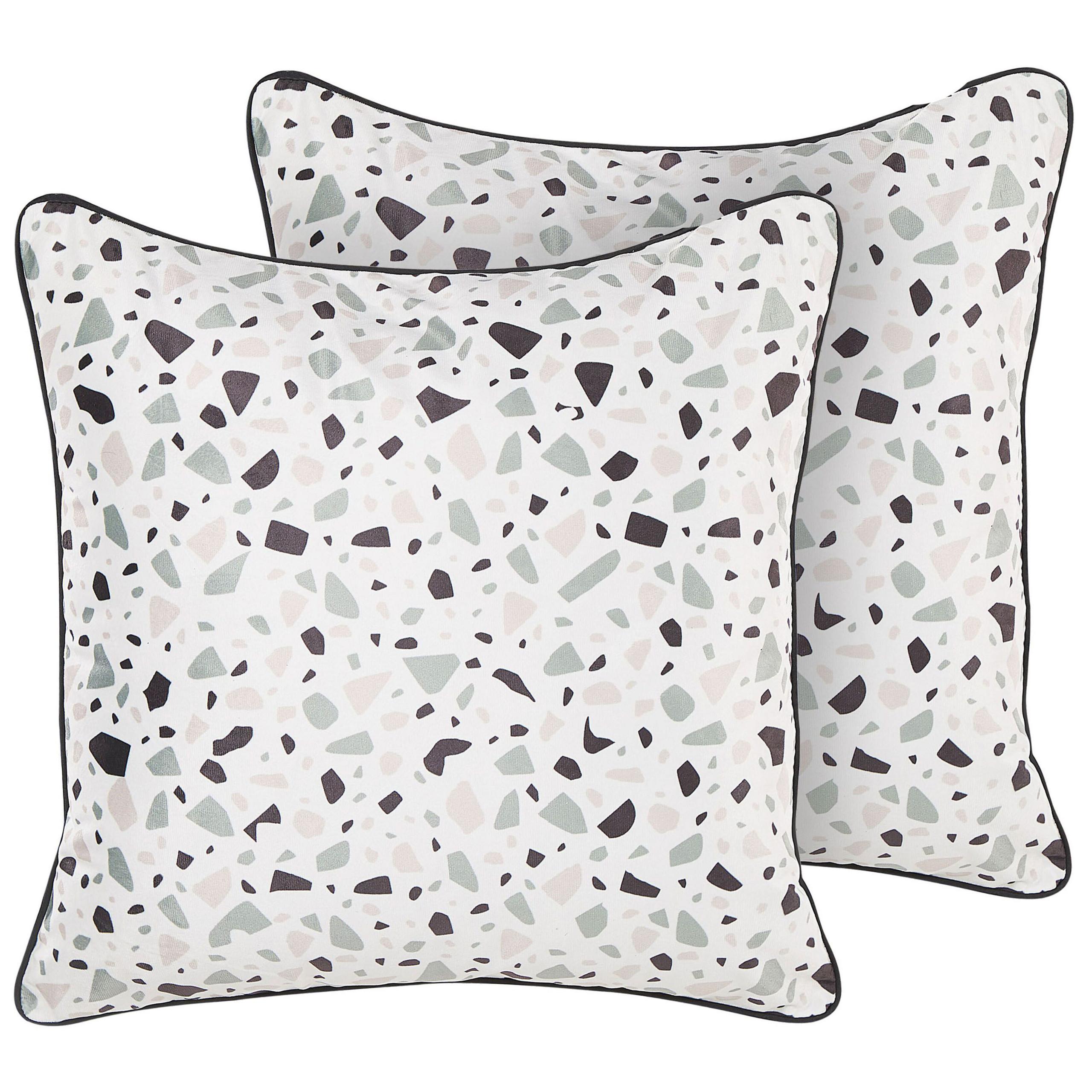 Lot de 2 coussins décoratifs carrés avec un passepoil noir. Ajoutez des éléments attrayants à votre espace de vie avec ces coussins élégants. Leurs housses, en velours, sont douces et agréables au toucher, tout en étant faciles à entretenir grâce à une fermeture éclair qui permet de les retirer et de les nettoyer rapidement. Les motifs, créés à partir de formes de tailles et de couleurs différentes, confèrent aux coussins un aspect et une sensation uniques, tandis que les bordures noires complètent l'ensemble.