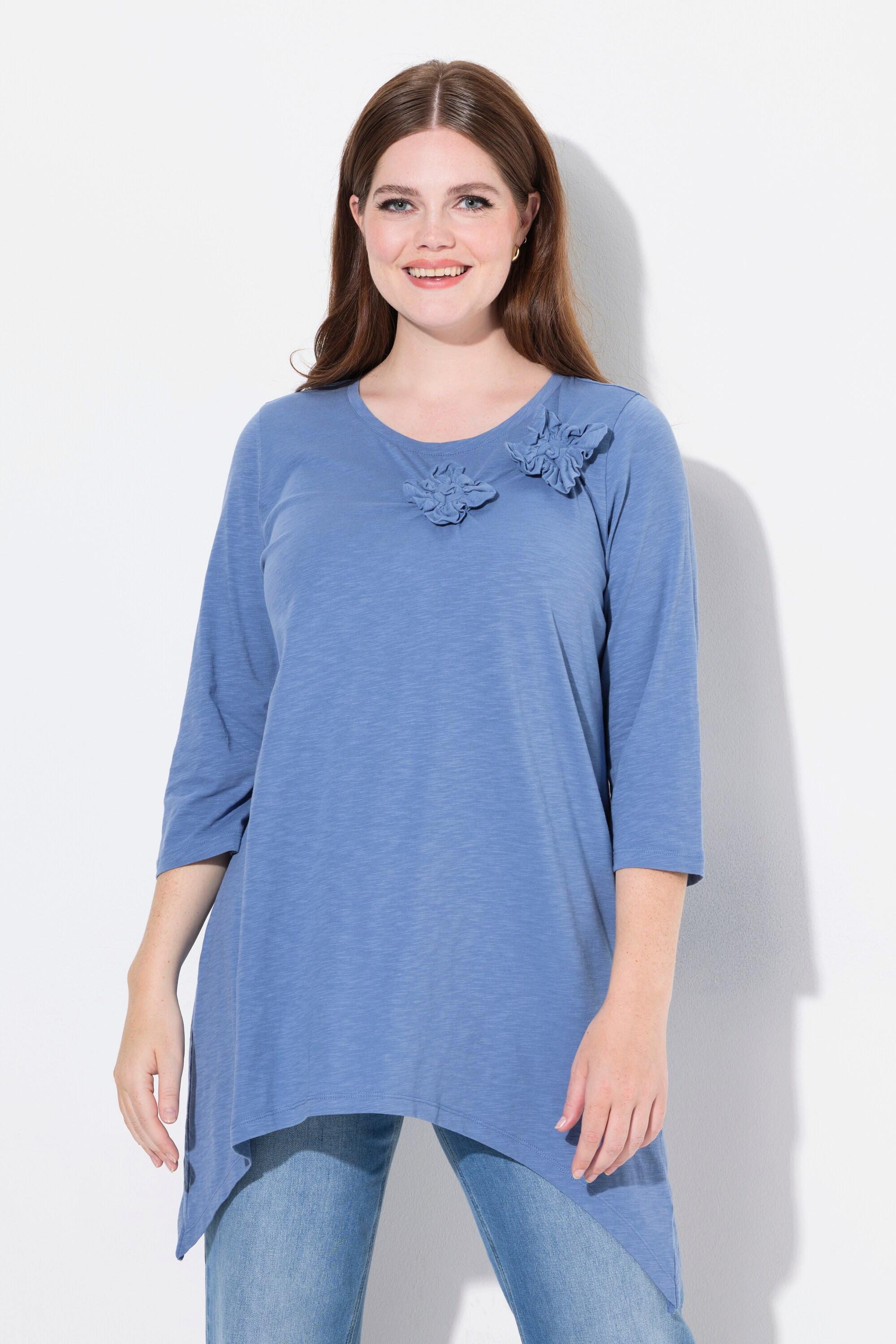 Cette chemise confortable de coupe évasée est confectionnée en jersey flammé doux et ornée de fleurs 3D décoratives sur la poitrine. Elle présente une encolure ronde, des manches 3/4 et un ourlet en pointes.