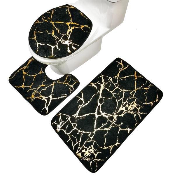 Ensemble de deux tapis de bain et d'une housse pour le couvercle des toilettes, le tout avec un design inspiré du marbre en noir et or. Vous pouvez facilement fixer le couvercle autour du couvercle des toilettes à l'aide de ses bandes élastiques. Toutes les pièces sont en peluche douce et les tapis ont une protection antidérapante sur le dessous, ce qui les rend à la fois confortables et sûrs.