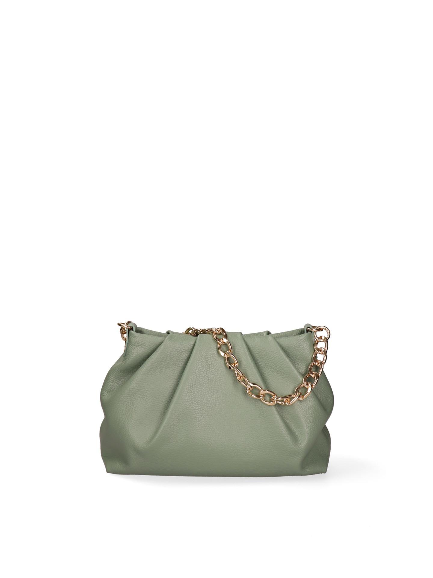 Ce sac bandoulière, fabriqué en Italie à partir de cuir véritable, présente un design plissé élégant et une chic bandoulière chaîne dorée, offrant un accessoire sophistiqué pour diverses occasions. Son intérieur compact mais spacieux le rend pratique pour transporter les essentiels quotidiens.