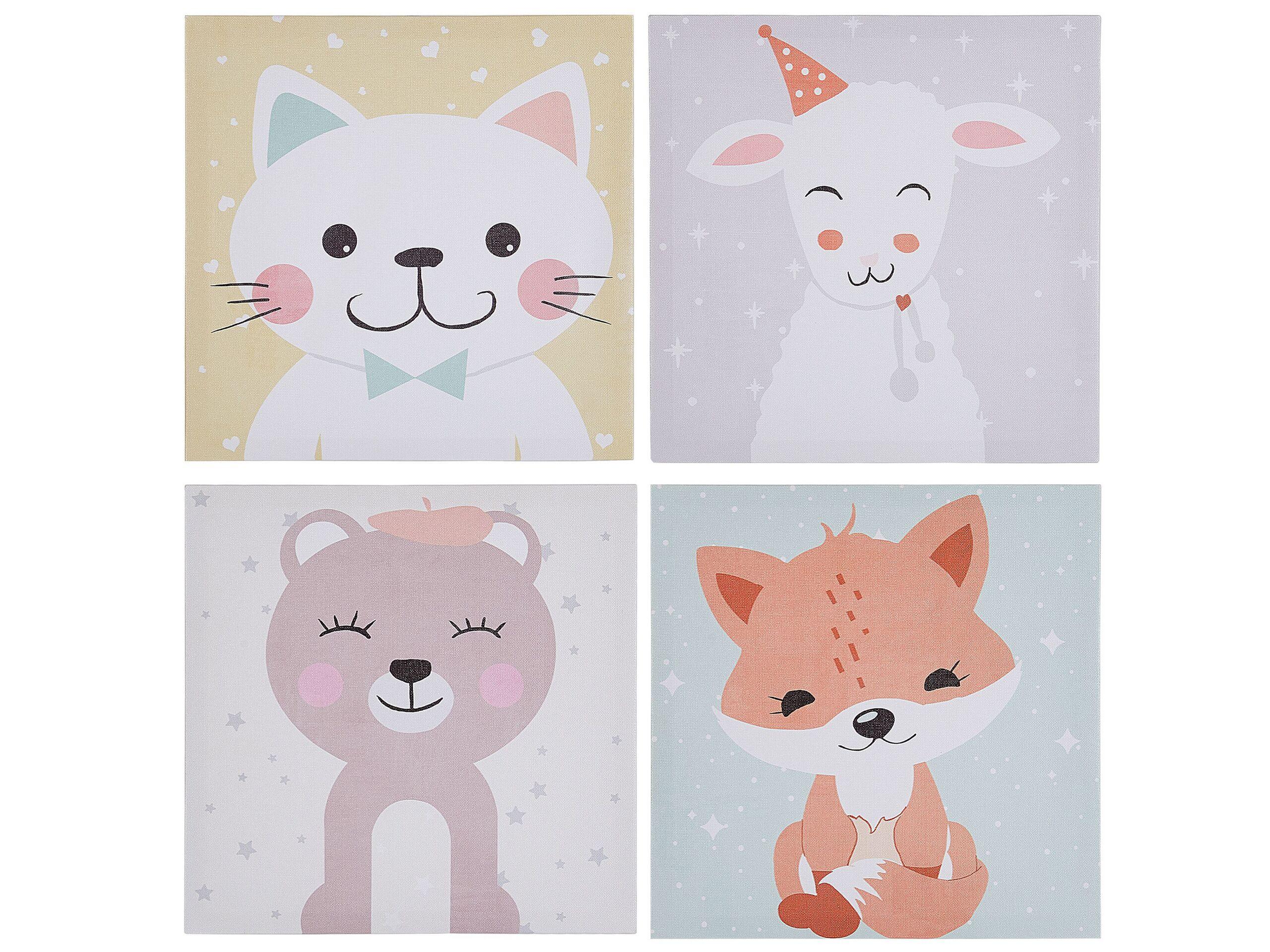 Set de 4 toiles imprimées multicolores pour chambre d'enfant 30 x 30 cm. Boostez le décor de la chambre de votre enfant ou bébé en créant un petit zoo sur le mur. Ce set de 4 toiles imprimées avec des images d'animaux souriants apportera beaucoup de gaîté dans la chambre de votre plus petit(e). Les bébés renards, ours, chaton et moutons encouragent votre enfant à jouer et à découvrir le monde des animaux. Ces tableaux peuvent être accrochés séparément ou ensemble pour former une jolie composition murale. Faites à partir de nylon durable et résistant à l'usure, ces toiles imprimées sont faciles à accrocher. Faites entrer dans la chambre de votre enfant un peu d'art et beaucoup d'optimisme.
