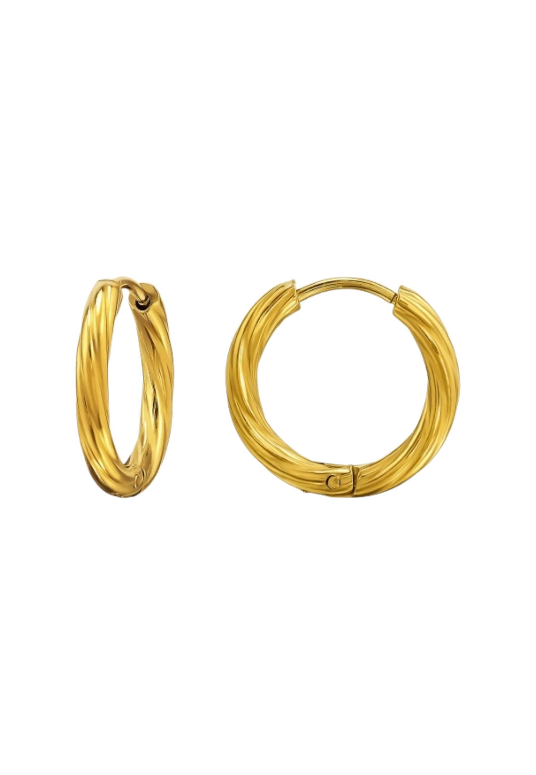 Une pièce distinguée de notre collection Steel & Titanium : ces créoles Huggie torsadées sont en acier inoxydable chirurgical avec finition IP/PVD dorée pour une touche luxueuse. Poids total 2,50g.