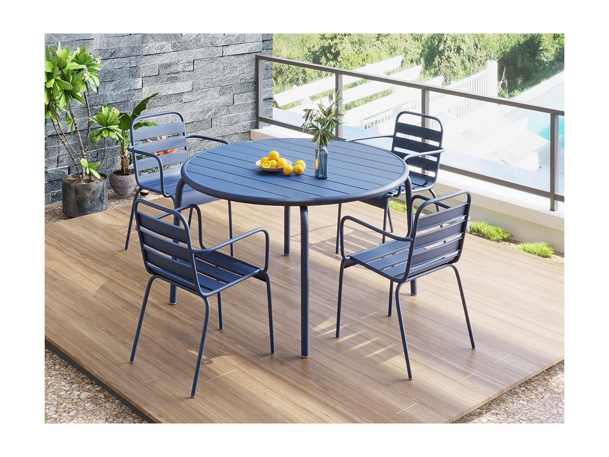 Vente-unique, Salle à manger de jardin en métal - une table D.110cm et 4 fauteuils empilables - Bleu nuit - MIRMANDE de MYLIA