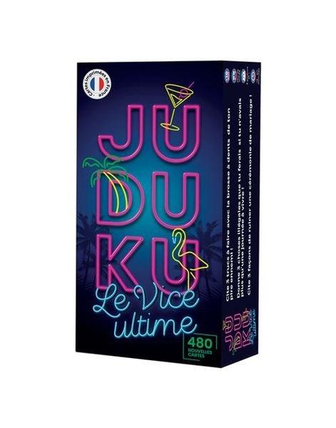 à partir de 16 ans moins de 30 min 3 à 10+ joueur(s) Retrouvez Juduku dans ce nouvel opus où vous devrez dévoiler vos pensées les plus sombres dans une ambiance années 80's.Juduku 3 le Vice Ultime c'est 480 nouvelles cartes pleines de vices ainsi que des cartes Action-Vérités. De quoi pimenter vos soirées et révéler les pires pensées de vos ami(e)s et de votre famille.Les règles restent similaires, les joueurs doivent en 8 secondes seulement, répondre à des questions du type :Cite 3 trucs à faire avec la brosse à dents de ton pire ennemi !Donne 3 signes avant-coureurs qu'un enfant va mal tourner !Cite 3 business à monter en Thaïlande !Et bien sûr, on garde notre démarche écoresponsable. SEA, SEX and FUN
