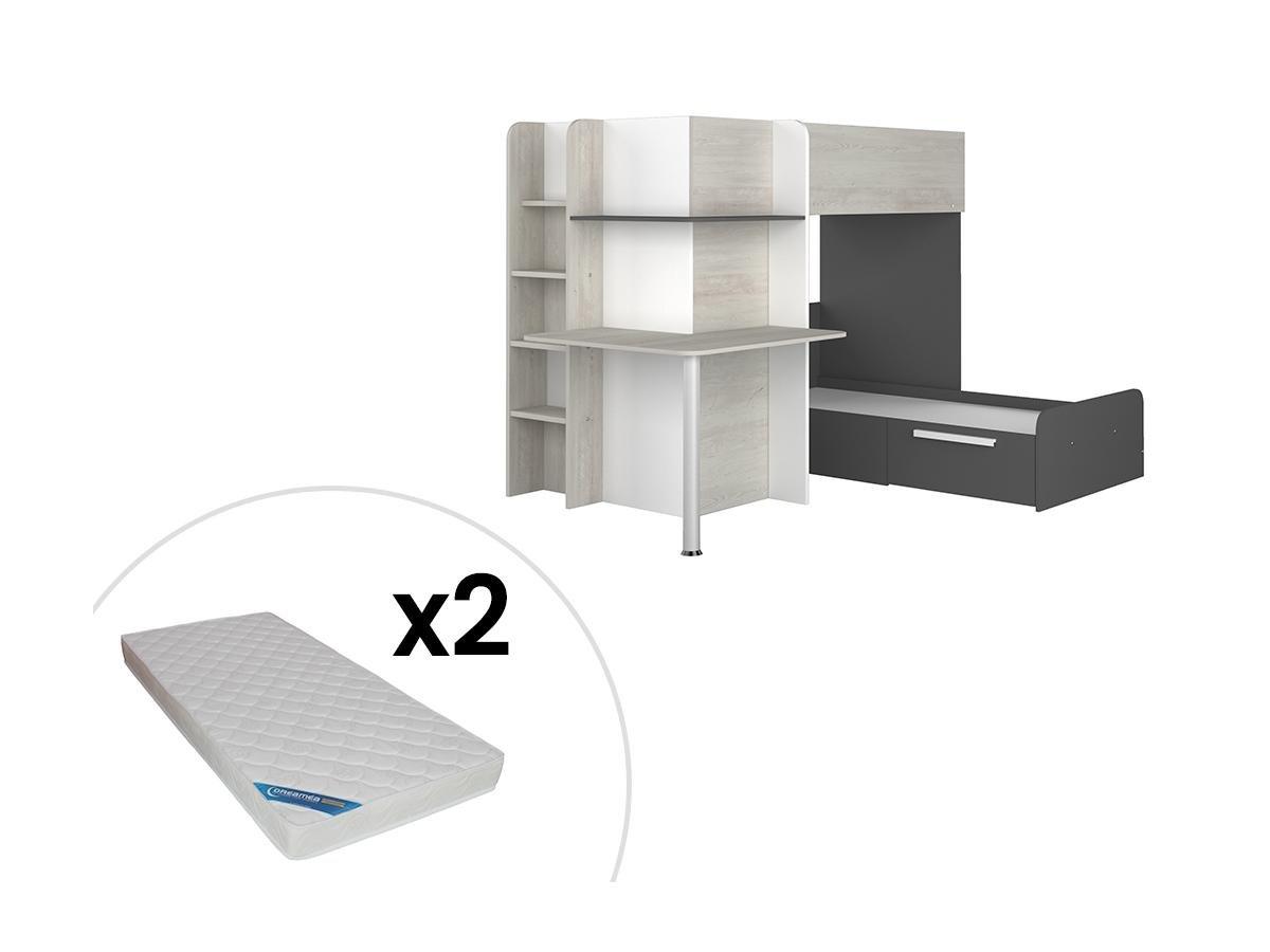 Vente-unique, Lits superposés d'angle 2 x 90 x 190 cm - Avec bureau - Gris, blanc et noir + Matelas - SAMUEL