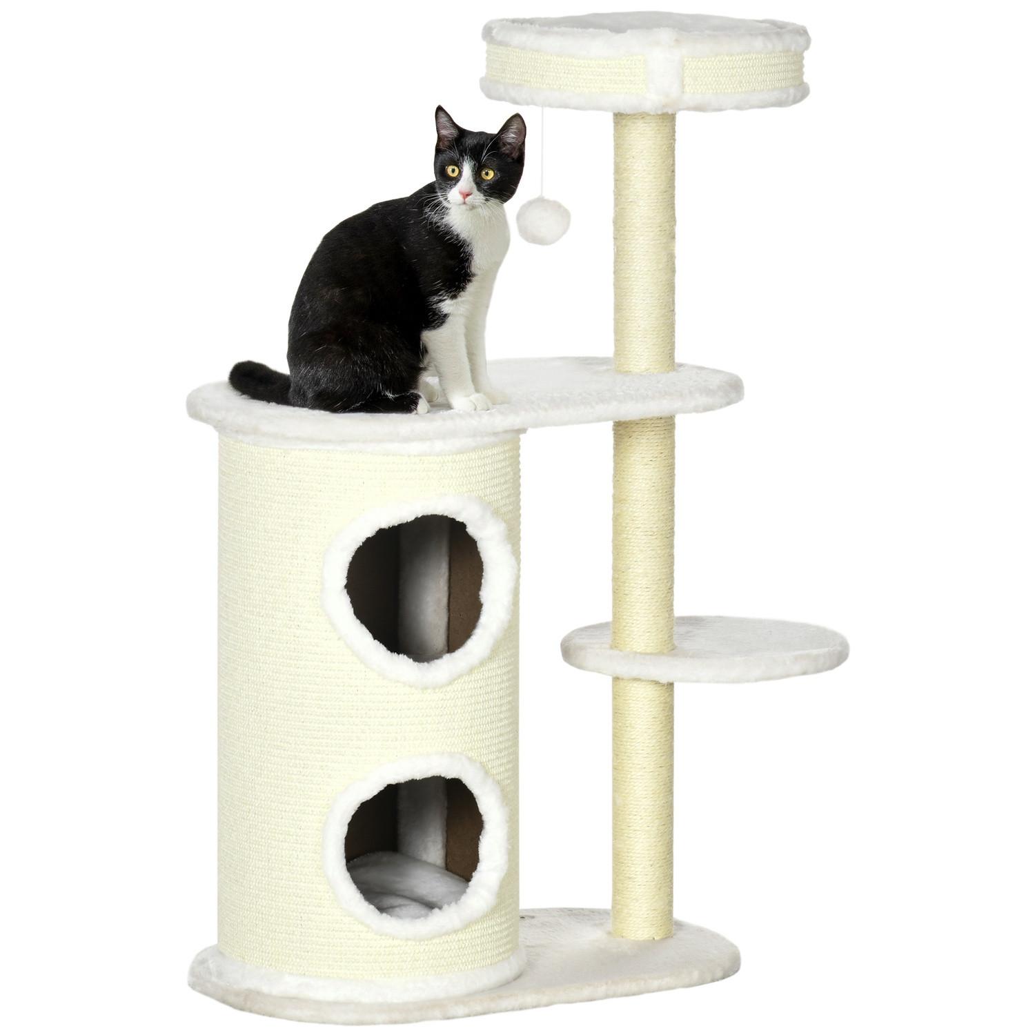 Satisfaites les instincts naturels de votre chat en toute sécurité avec cet arbre à chat ! Cet arbre à chat comprend des griffoirs en corde de sisal, des plates-formes, un lit pour chat, une grotte à chat à double couche et une balle suspendue pour un jeu polyvalent. Avec cet arbre grimpant, vos meubles restent exempts de rayures. Offrez à vos chats joueurs un endroit sûr pour aiguiser leurs griffes au centre d'activités pour chats.