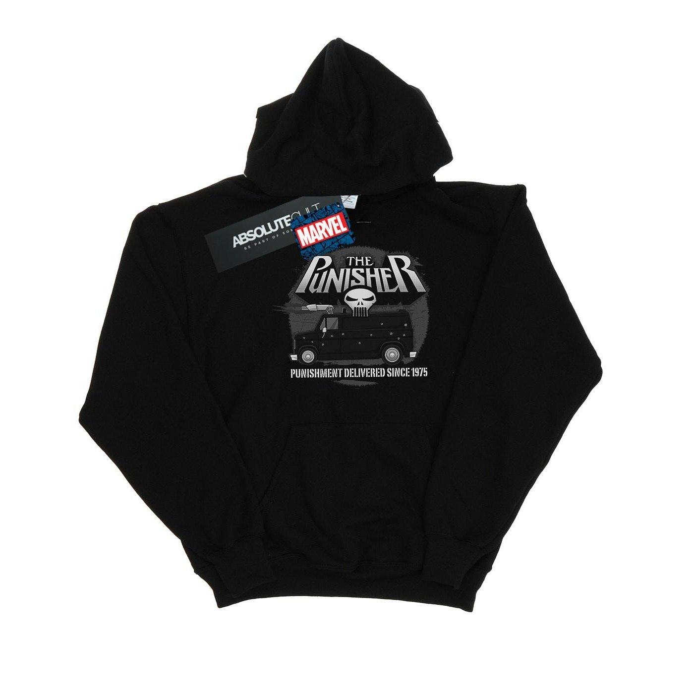 Ce sweat à capuche présente un imprimé graphique du Battle Van de The Punisher, ce qui en fait un ajout distinctif à la garde-robe de tout fan. Le design comprend le logo emblématique du crâne et la phrase « Punishment Delivered Since 1975 ».