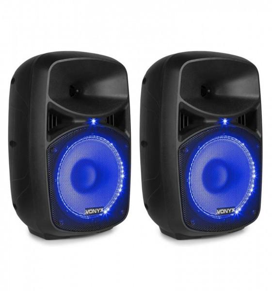 Le VPS082A est un set Plug & Play, parfait pour vos soirées. Le set comprend une paire d'enceintes 8, un modèle passif et un actif. Dans l'enceinte active, un amplificateur avec lecteur USB/SD intégré et avec technologie sans fil BT qui vous permet de streamer votre musique depuis votre Smartphone ou tablette. Les deux enceintes possèdent un anneau de LEDs bleues autour du boomer pour illuminer votre soirée. Pour compléter le système, un microphone filaire est livré. Idéal pour des karaokés, présentations...