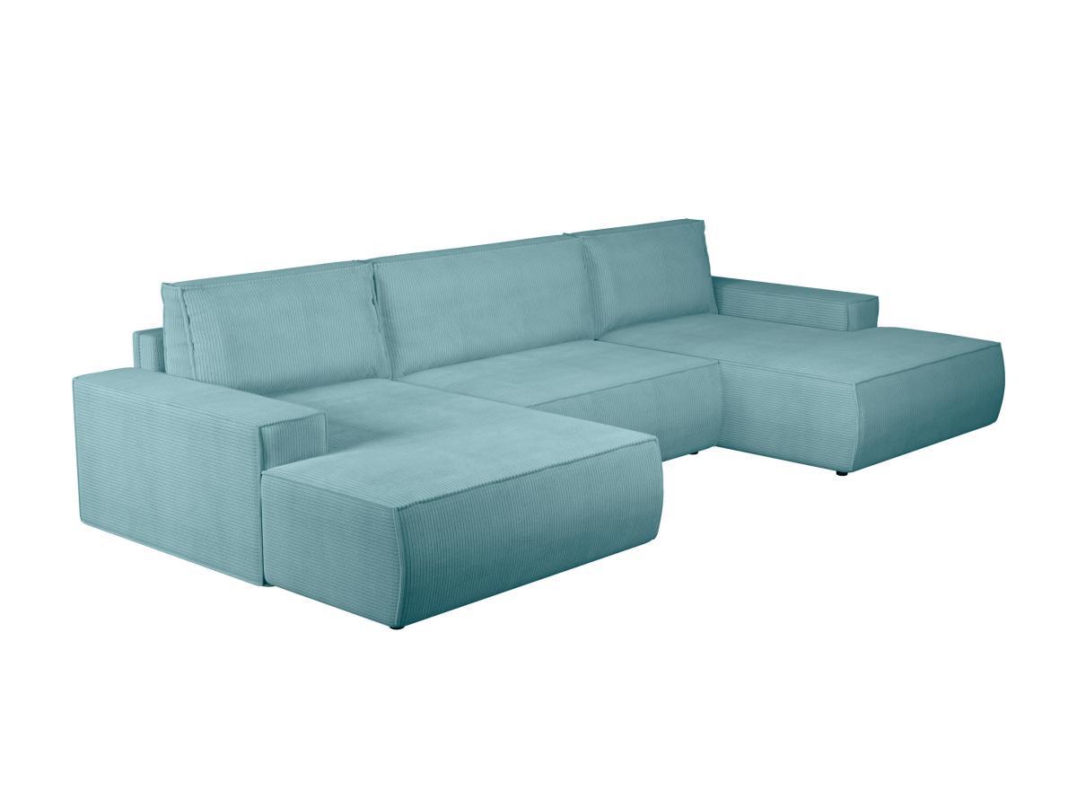 Vente-unique, Grand canapé d'angle panoramique convertible en velours côtelé bleu turquoise AMELIA