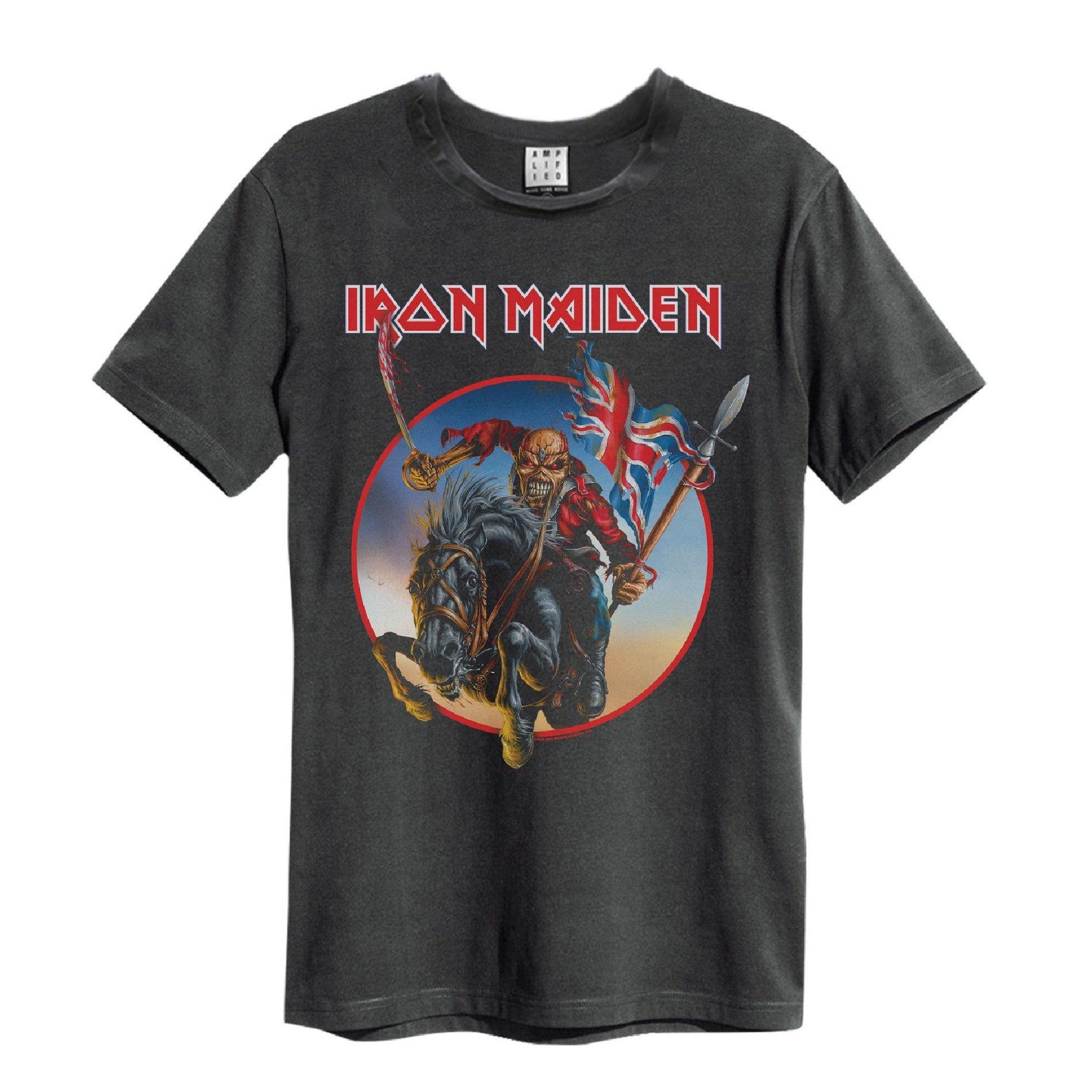 Ce T-shirt présente un graphique saisissant de la mascotte emblématique d'Iron Maiden, Eddie, en tant que « The Trooper » à cheval, tenant une épée ensanglantée et un drapeau Union Jack. Le design est placé sur un fond circulaire, capturant l'énergie dynamique de l'imagerie classique du groupe. Le T-shirt a un col rond classique et des manches courtes, offrant une coupe confortable et polyvalente.
