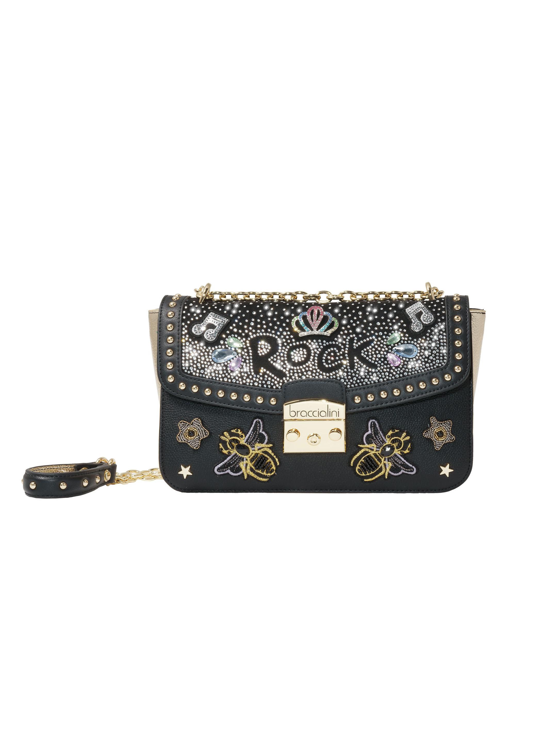 Ce sac à bandoulière présente un design saisissant avec une esthétique inspirée du rock. Le rabat avant est orné de décorations scintillantes, incluant le mot « Rock » en caractères gras, des notes de musique et un motif de couronne, le tout sur un fond clouté. Le corps du sac est détaillé avec des abeilles et des étoiles brodées, ajoutant à son charme unique. Une bandoulière chaîne dorée offre une option de transport élégante, complétée par une fermeture à pression sécurisée.