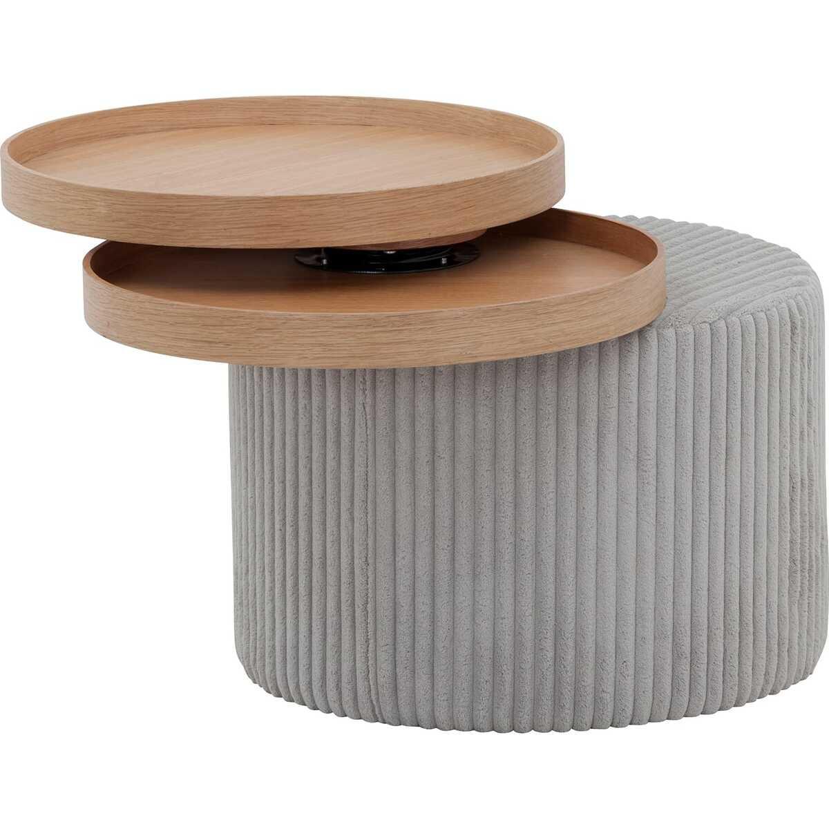 Table d'appoint ronde en MDF recouvert de tissu texturé (100% polyester) et 2 plateaux en MDF plaqué chêne.