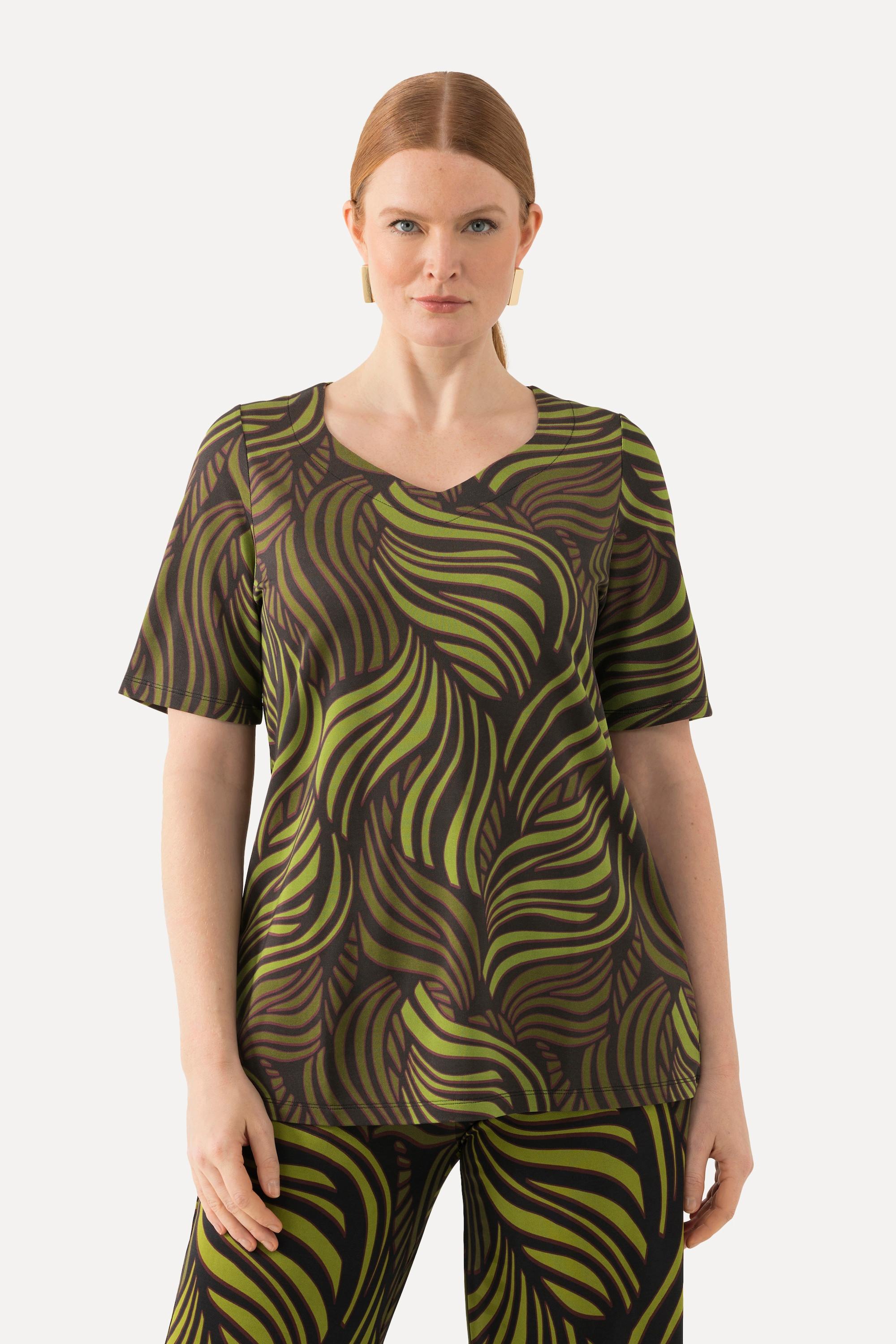 Ulla Popken Slinky T-shirt Imprimé Feuilles de Palmier Col Coeur Manches Courtes