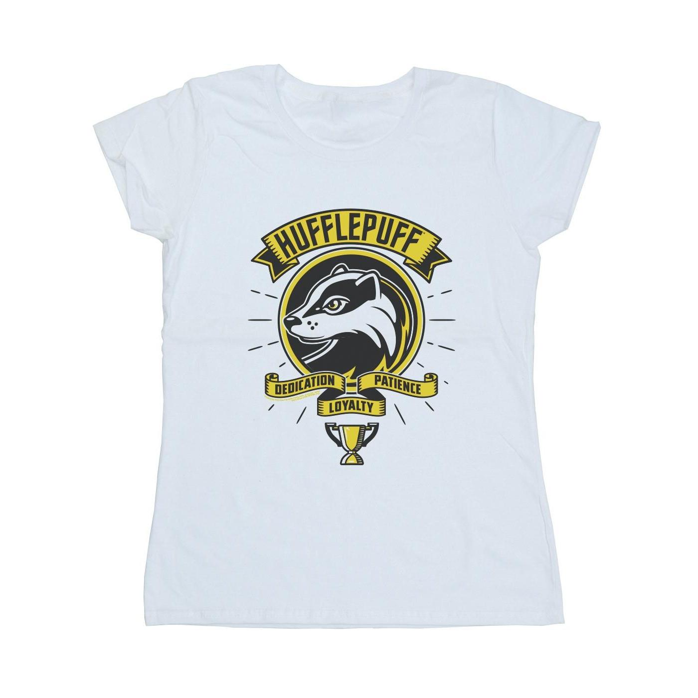 Ce T-shirt Hufflepuff présente un imprimé graphique proéminent de l'écusson du blaireau Hufflepuff, complété par le nom de la maison et les valeurs fondamentales de dévouement, de patience et de loyauté. Le design est centré sur le devant du T-shirt, ce qui en fait une pièce maîtresse pour les fans.