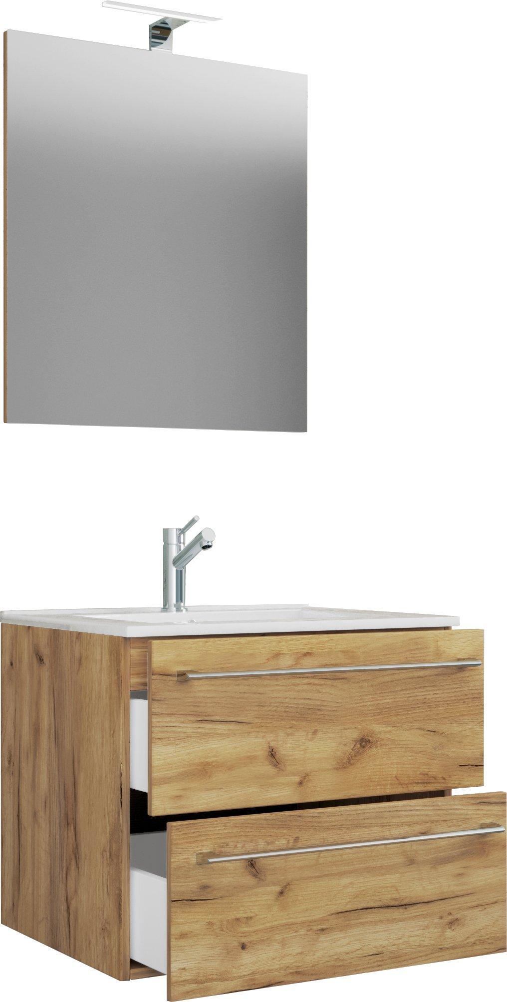 Set composé de : - 1x armoire basse avec deux tiroirs - 1x lavabo en céramique - 1x miroir en verre de sécurité trempé L'ensemble de meubles de salle de bains se compose d'une armoire basse avec deux tiroirs sur des rails métalliques robustes. Un lavabo moderne en céramique massive et un miroir en verre de sécurité ESG complètent le meuble afin d'obtenir le point de mire parfait dans la salle de bains. Meuble sous-lavabo - Dimensions H. 52 x l. 61 x P. 46 cm ou H. 52 x l. 81 x P. 46 cm - Corps en mélamine robuste et inusable - Deux grands tiroirs avec coulisses métalliques durables - Poignée aspect aluminium en métal Vasque : - Dimensions H. 17 x l. 60 x P. 46 cm ou env. H. 17 x L. 80 x P. 46 cm - En céramique robuste Miroir : - Dimensions H. 40 x L. 60 P. 2 cm ou env. H. 40 x L. 80 P. 2 cm - Verre en verre de sécurité ESG Le meuble peut être complété par d'autres meubles de salle de bains "VCM Badinos" et par l'éclairage "VCM Blino". Depuis les années 70, VCM s'est spécialisé dans la