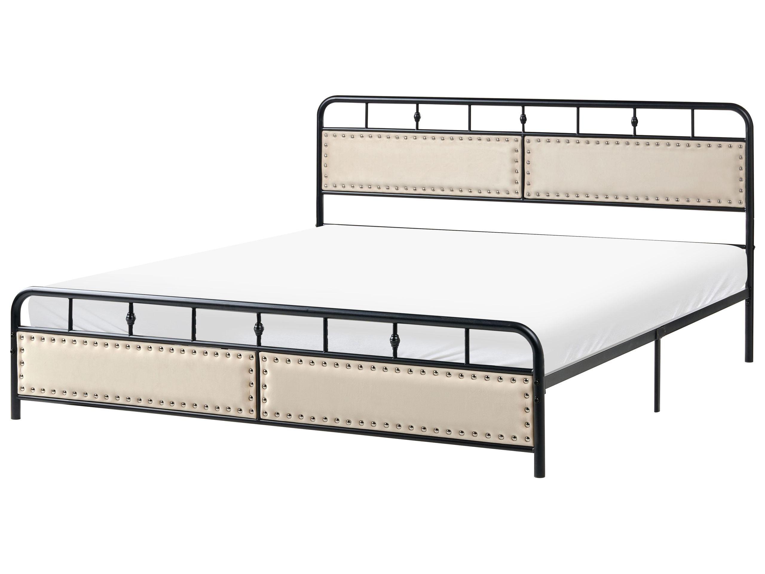 Cadre de lit double robuste riveté. Ce lit robuste crée instantanément une atmosphère élégante et raffinée dans la chambre à coucher. Fabriqué en fer solide, le cadre est mis en valeur par des panneaux rembourrés uniques sur la tête et le pied de lit, rehaussés de rivets décoratifs. Cette combinaison de métal industriel et de tissu doux ajoute une touche de glamour subtil. Il s'agit d'une option durable et tendance, conçue pour un confort à long terme.