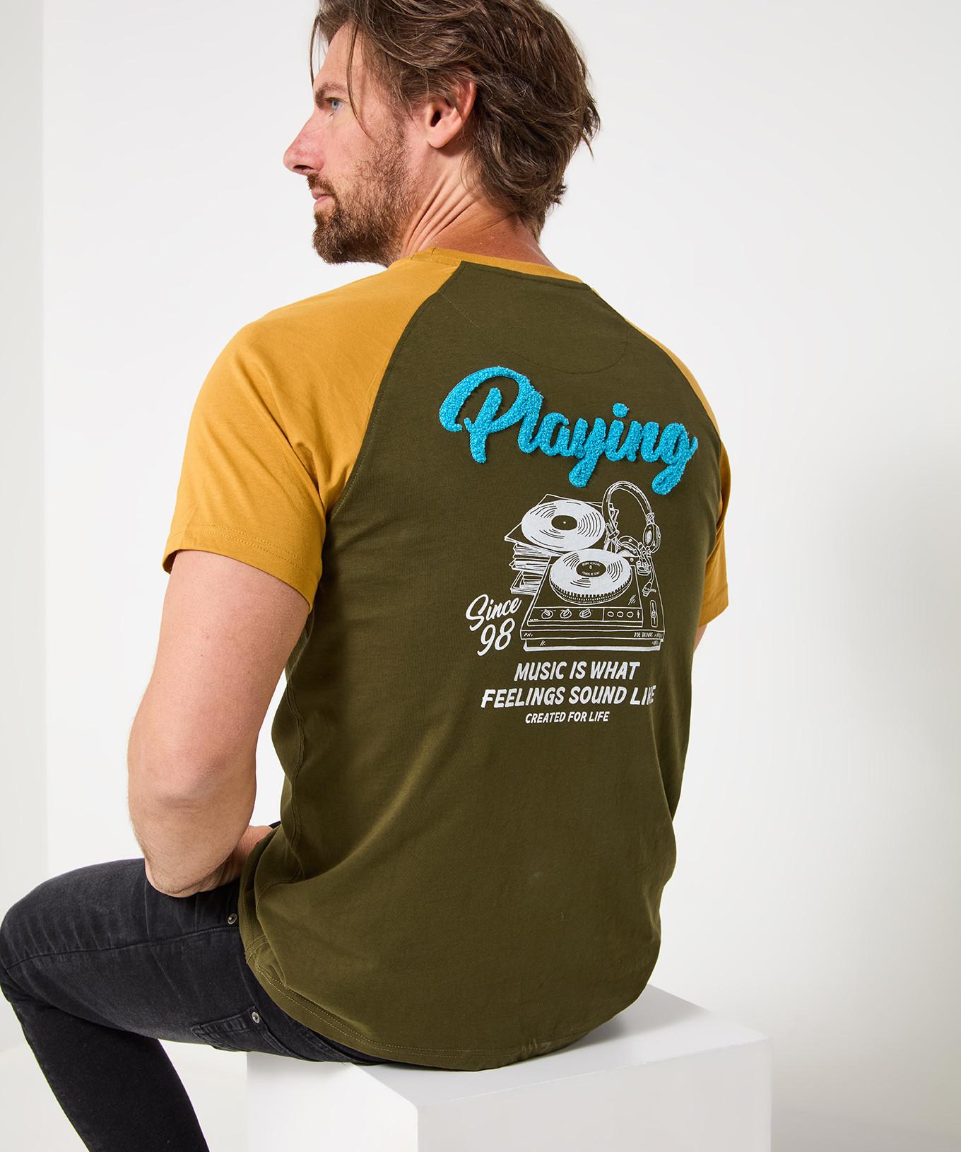 Ce t-shirt à col rond présente un motif distinctif de platine DJ au dos, en faisant une pièce remarquable pour les passionnés de musique. Le design comprend un graphique d'une platine avec des disques et des écouteurs, accompagné du texte "Playing Since 98 Music is what feelings sound like Created for life." Le t-shirt est conçu avec des manches raglan contrastantes, ajoutant une touche élégante à son allure décontractée.