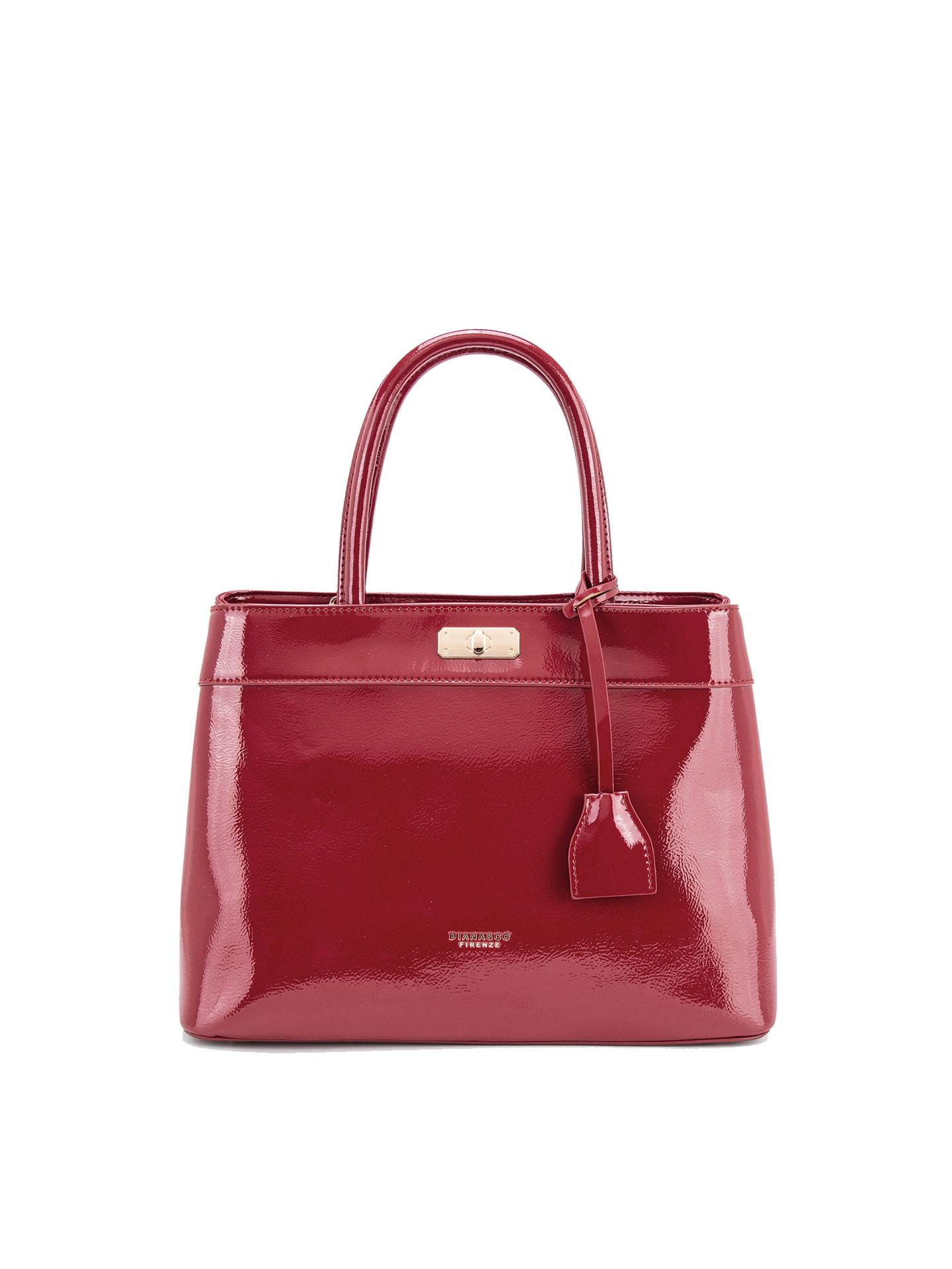 Cet élégant sac à main présente une finition brillante et une silhouette structurée, ce qui en fait un accessoire sophistiqué pour diverses occasions. Le design comprend une fermeture à tourniquet sécurisée et une étiquette décorative, ajoutant à son esthétique raffinée. Il est équipé de poignées supérieures robustes pour un transport confortable.