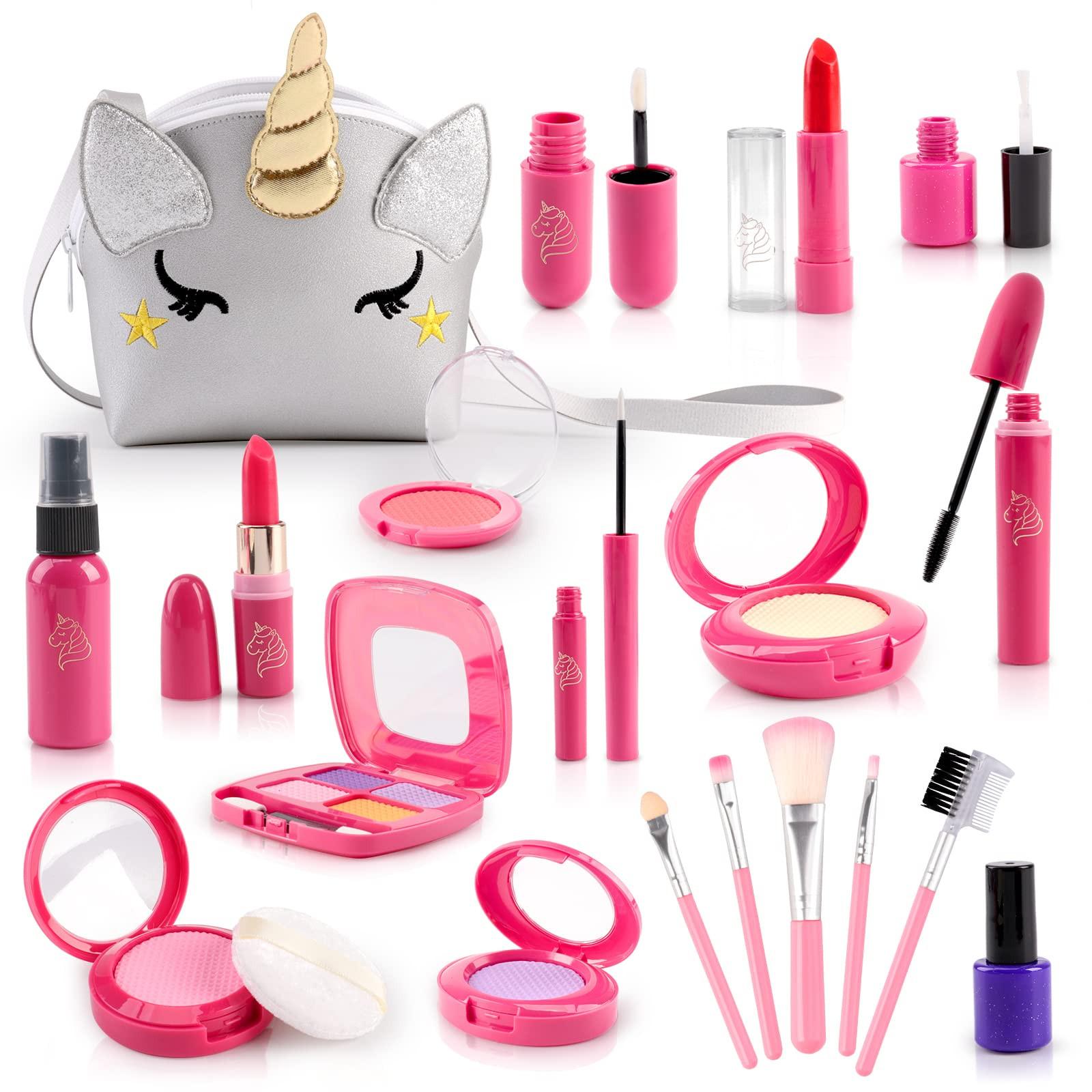 La trousse de maquillage pour enfants comprend un ensemble de faux maquillage, 21PCS : sac cosmétique mignon, poudre brillante1, ombre à paupières1 (4 couleurs), blush1, rouge à lèvres2, gloss1, mascara1, eyeliner1, vernis à ongles2, pinceau de maquillage5, crayon à sourcils1, vaporisateur vide1, houppette1.La trousse de maquillage pour enfants rend le jeu plus réel. Après avoir joué avec le kit de maquillage, les enfants peuvent remettre les accessoires dans le sac. Cela peut nourrir la capacité des enfants à nettoyer. Le kit de maquillage pour filles est facile à transporter en voyage. La trousse de maquillage Inder pour filles contient non seulement tous les éléments essentiels du maquillage, mais elle est également livrée avec un beau sac à main de maquillage. Les filles peuvent jouer à une variété de jeux différents avec le kit de maquillage parfait pour les enfants, le jeu de rôle, le déguisement de princesse et les activités quotidiennes amusantes pour les enfants ! Cela peut les aider à apprécier leur vraie nature de beauté. Le kit de maquillage pour les enfants en bas âge est conçu pour améliorer l'esthétique des filles, stimuler l'imagination et exercer la motricité fine et les compétences d'auto-maquillage. La petite princesse peut jouer au kit de maquillage toute seule ou avec ses parents, ses amis ou ses poupées. C'est un bon cadeau de maquillage pour les petites filles âgées de 3 ans et plus. Dimensions : 17,5 x 13,5 x 6 cm