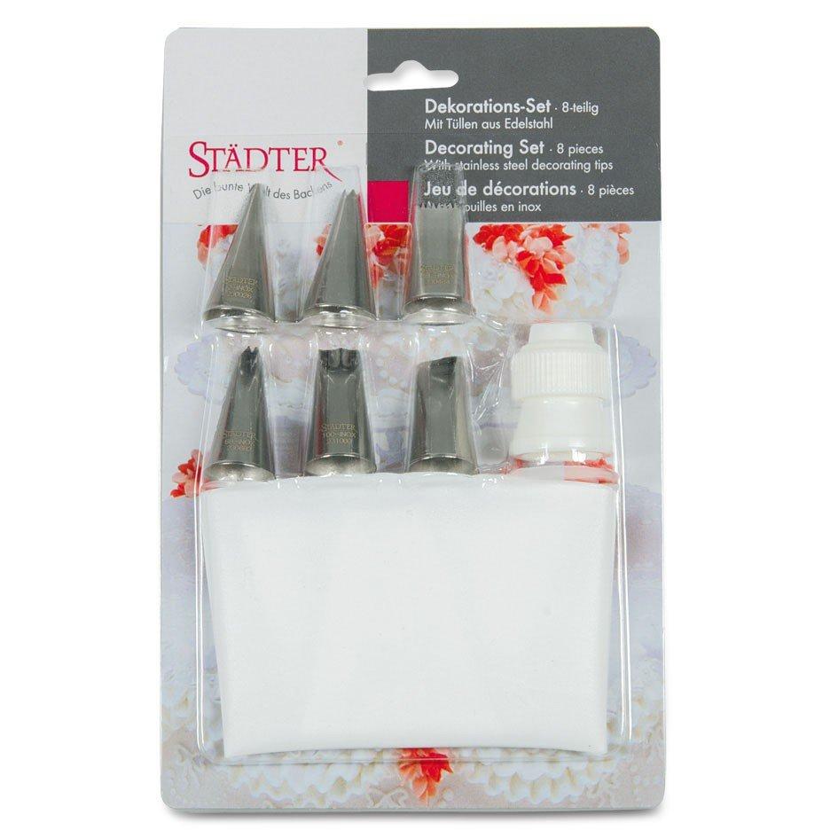Avec ce set, vous créez des décorations nobles et variées pour les gâteaux et les cupcakes. Avec seulement quelques douilles, vous créez de magnifiques roses, feuilles, petits pois, rosaces et toutes sortes de décorations de bord, par exemple des vanneries, des ruches, des rosaces ou de fines rayures. Pour changer facilement les douilles, le set comprend également un adaptateur ainsi qu'une poche à douille réutilisable. Quantité : 8 pièces Pays de production : Allemagne Contenu de l'emballage/du kit : 6 douilles en acier inoxydable : 1 douille à trou, 1 douille à étoile, 1 douille à ruban étoilé, 1 douille à feuille, 1 douille à rose, 1 douille à volute ; 1 adaptateur et 1 poche à douille de 25 cm Matériau : Acier inoxydable
