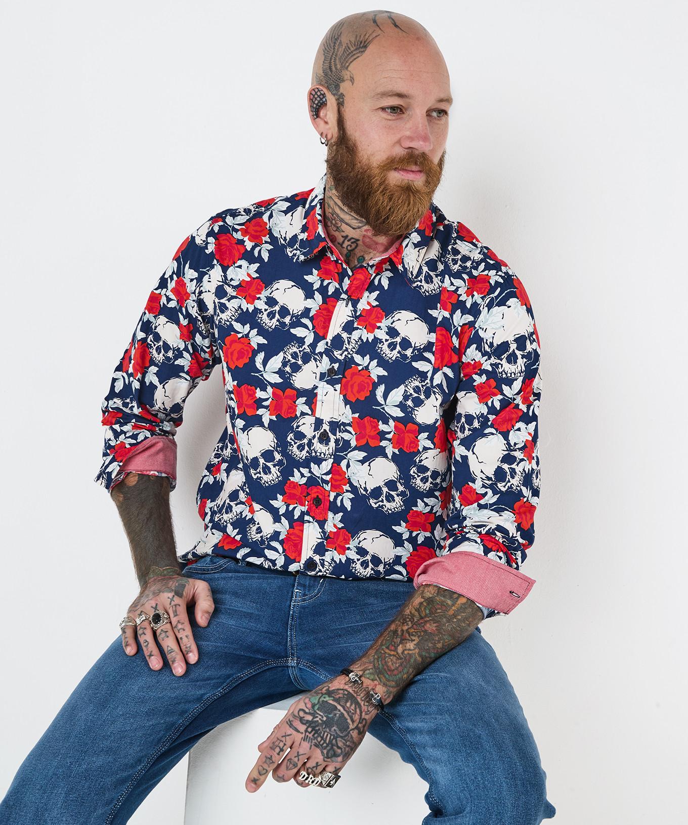 Cette chemise à manches longues présente un imprimé saisissant de roses et de crânes, offrant un look audacieux et distinctif. Le design combine des éléments classiques avec une esthétique avant-gardiste, ce qui en fait une pièce polyvalente pour diverses occasions.