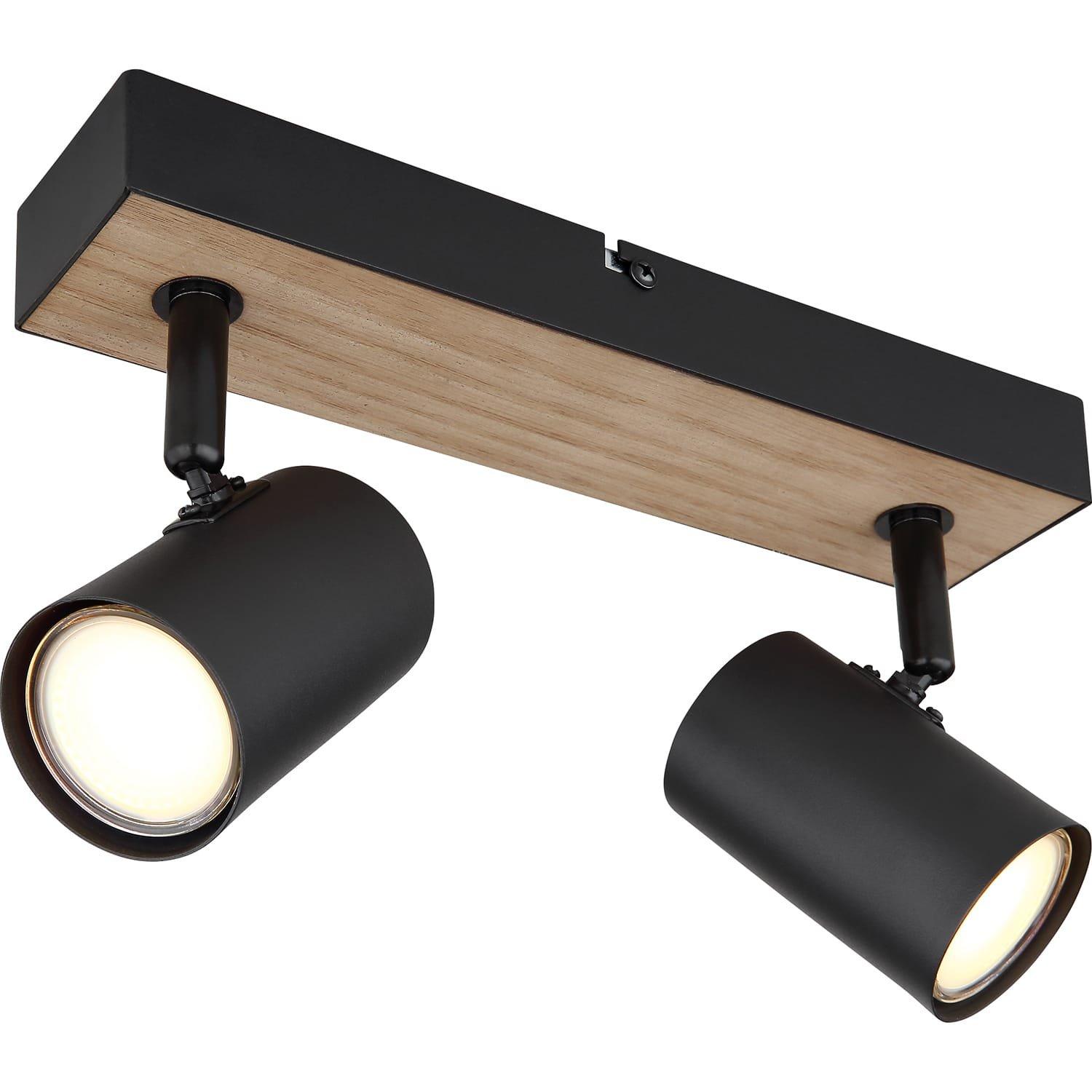 Ce spot simple impressionne par son design et sa palette de couleurs. Il y a deux douilles GU10, chacune recouverte d'un abat-jour cylindrique, sur un support de plafond rectangulaire en métal noir mat et MDF aspect bois (26 x 6 cm). La douille GU10 permet de choisir les ampoules jusqu'à une puissance maximale de 35 watts.