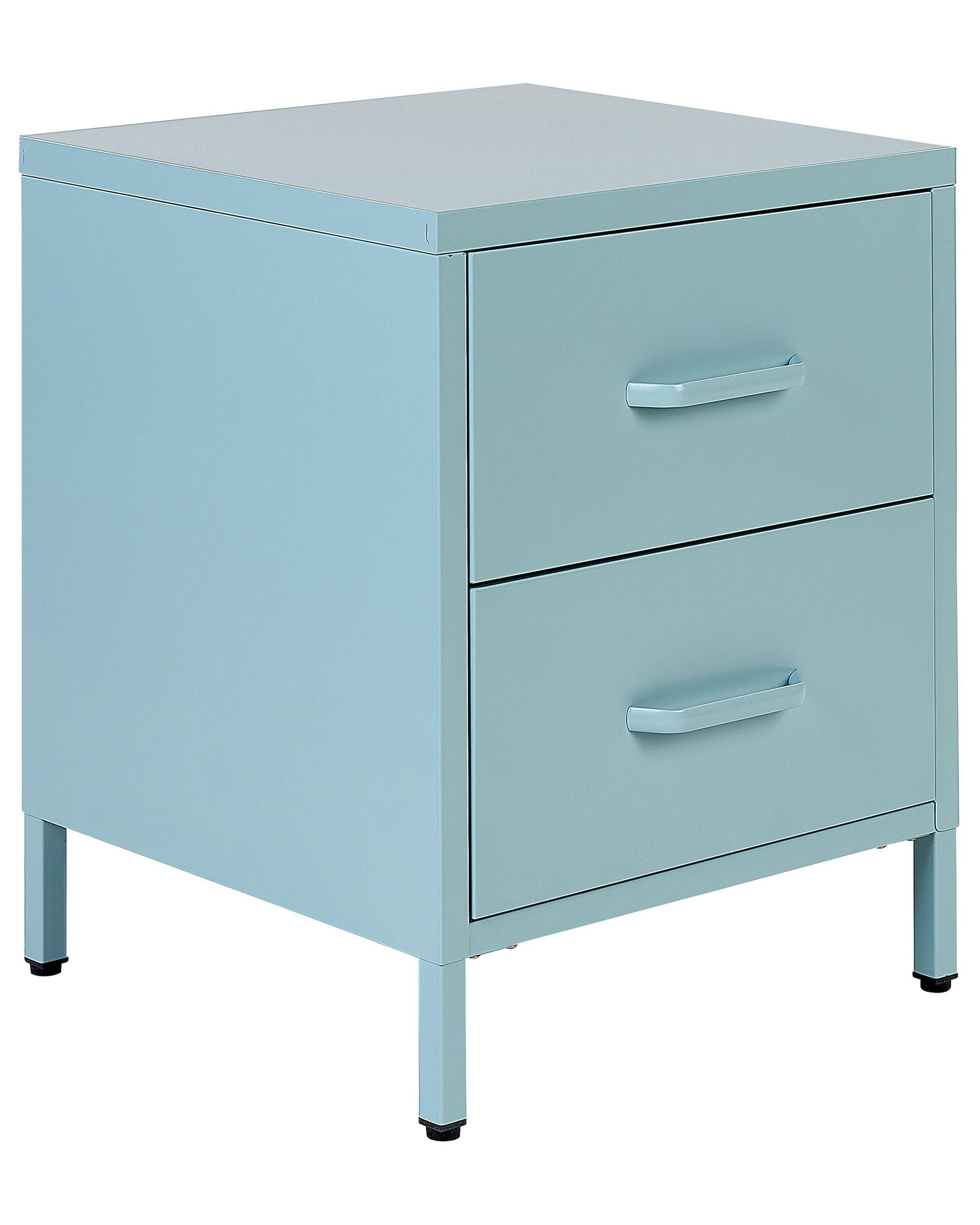 Table de chevet moderne. Une table de chevet avec de grands tiroirs est une nécessité dans chaque chambre à coucher, c'est pourquoi notre pièce est un moyen parfait d'améliorer votre espace de sommeil. Fabriquée en acier durable et facile à entretenir, cette table de nuit est sûre de durer de nombreuses années. Elle comporte deux tiroirs, qui peuvent être utilisés pour ranger vos sous-vêtements, vos livres ou d'autres objets importants dont vous pourriez avoir besoin le soir ou le matin. Sa couleur bleu clair et son design épuré en font un ajout parfait à la chambre à coucher, quel que soit le style de décoration.