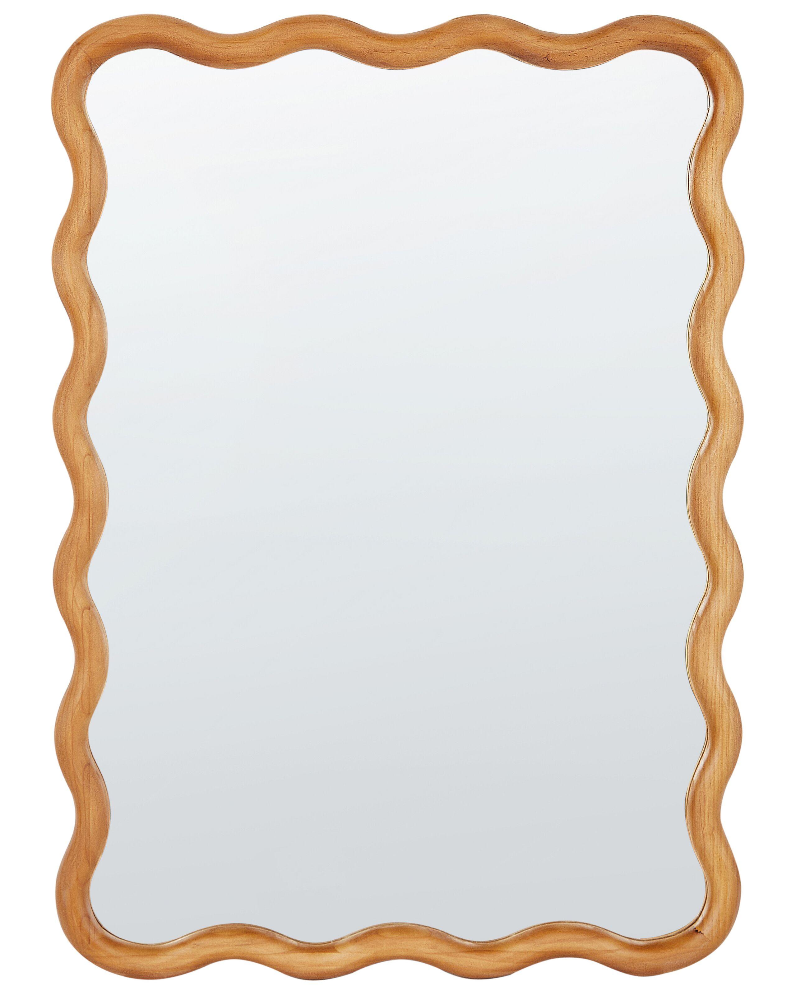 Miroir décoratif suspendu fait à la main. Ce miroir mural décoratif s'intégrera parfaitement à tout intérieur moderne, rafraîchissant l'espace grâce à son design intemporel. Fabriqué en bois de pin durable et facile d'entretien dans une teinte claire, cet accessoire attire l'attention par sa forme irrégulière et ondulée. De plus, elle peut être facilement suspendue grâce à la fixation située à l'arrière.