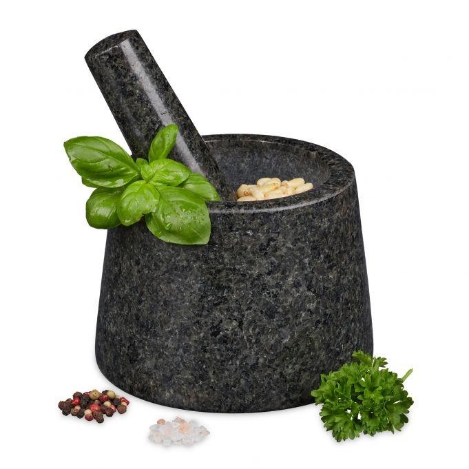 Des biscuits finement broyés pour une belle base de gâteau croustillante, du pesto fait maison ou même du poivre noir fraîchement moulu - broyer les ingrédients de cette manière traditionnelle est toujours un peu spécial et diffuse également de jolis arômes dans la cuisine. La pierre naturelle dure est parfaite pour broyer les épices, les herbes et les noix et libère les merveilleux arômes des aliments. L'intérieur du mortier et l'extrémité du pilon ont une structure plus grossière pour de très bons résultats. Il convient également à la fabrication de pommades et d'autres remèdes maison.