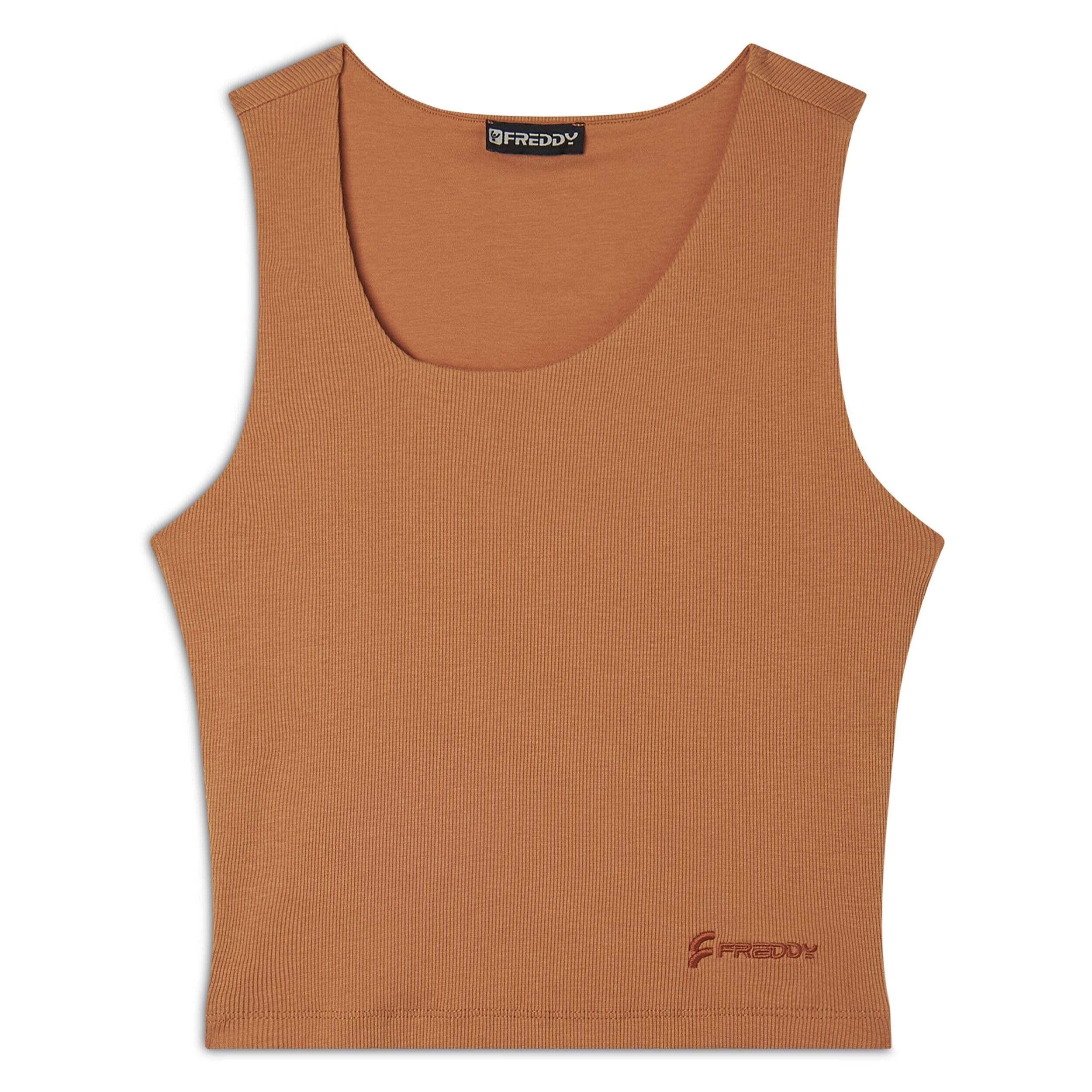 Ce top court se caractérise par une coupe slim qui met la silhouette en valeur. Fabriqué en coton élastique côtelé, il offre un confort sans compromis. Il présente une encolure asymétrique raffinée et de larges bretelles, idéales pour un look original et féminin. Le logo emblématique de Freddy brodé sur le bas ajoute une touche d'élégance au vêtement. Il est parfait pour les tenues décontractées et chic ou pour donner du caractère à un look basique.