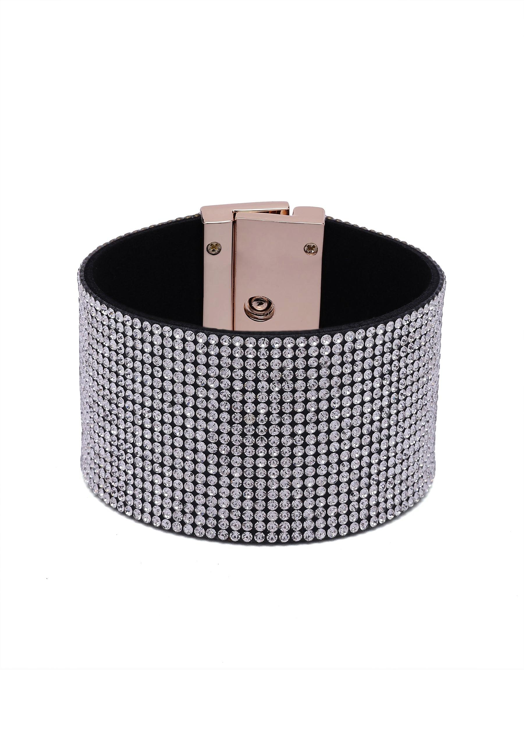 Habillez votre poignet d'une aura de diva. Ce large bracelet manchette en cuir est orné de cristaux transparents, créant un éclat digne des plus grandes stars. Doublé de daim doux et doté d'un fermoir élégant et poli, c'est un bijou audacieux et luxueux, parfait pour les soirées où vous souhaitez attirer tous les regards. Dimensions : Diamètre 6,5 cm, Longueur 20 cm, Largeur 4 cm | Placage : Doré | Fermeture : Boucle magnétique