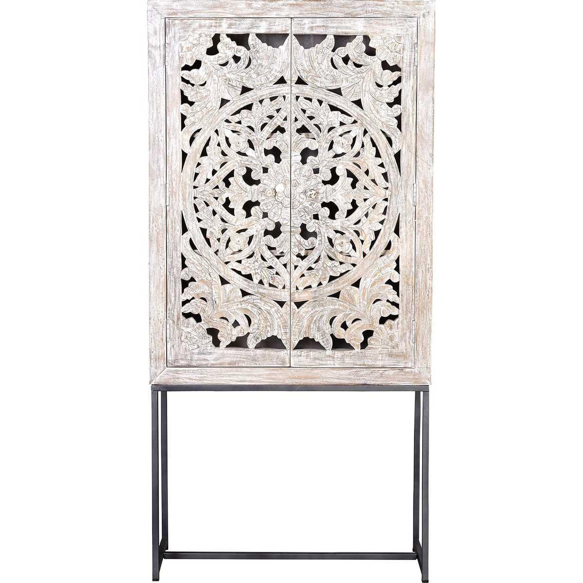Armoire en bois de manguier et base métallique, avec portes sculptées à la main. Dimensions des portes : 104 x 37 cm. Hauteur des compartiments intérieurs : 33 cm. Hauteur des pieds : 61 cm. La base nécessite un montage.