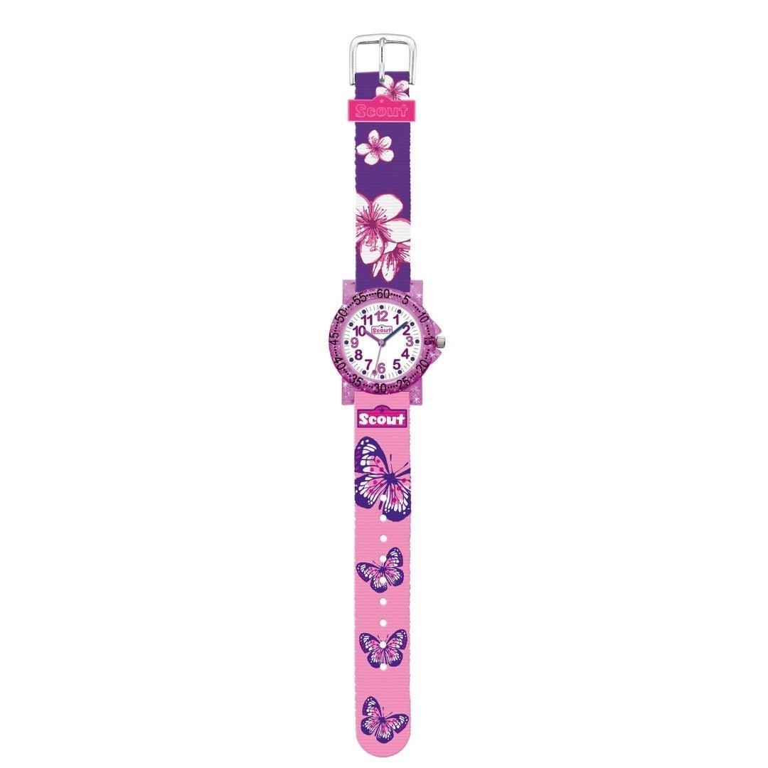 Papillons et fleurs de cerisier. Les motifs Scout sur le bracelet correspondent à ceux des modèles de cartables 'Asia Flower' et 'Cool Girl'. Le cadran au design sobre et lisible facilite la lecture de l'heure. Cette montre a un bracelet textile souple (lavable à 30°C en machine) et le boîtier est en polycarbonate transparent, avec protection de la couronne, et est en outre travaillé avec des particules scintillantes. Le fond est en acier inoxydable poli, le verre de la montre est fabriqué à partir d'un verre minéral trempé et est donc très résistant aux rayures. Le mouvement à quartz à 3 aiguilles est très robuste et de grande qualité. De plus, la montre est étanche jusqu'à 5 bars (selon la norme DIN 8310).