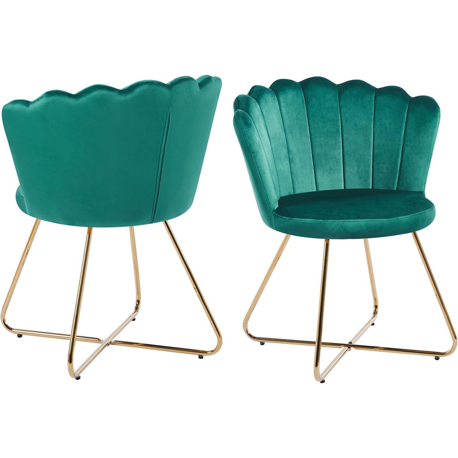 Échappez au quotidien et profitez d'un petit moment de détente. Cet ensemble de chaises modernes au design en forme de coquillage séduit par son revêtement en velours et convainc par son assise et son dossier arrondis. Le piètement design croisé en métal doré garantit non seulement une bonne stabilité, mais offre également un magnifique contraste avec le revêtement de la chaise. Grâce au rembourrage de l'assise et du dossier et à la forme stylée, vous bénéficiez d'un confort d'assise de première classe. La forme arrondie donne un aspect doux. La chaise peut servir de chaise de salle à manger dans la salle à manger ou, par exemple, de siège sur la table de maquillage. Quel que soit l'endroit où elle est placée, cette chaise coquillage attire tous les regards.Pieds en chrome doréhauteur d'assise : 47,5 cmProfondeur d'assise : 48,5 cmLargeur de l'assise : 54,5 cmDistance entre les pieds : devant env. 50 cm, sur les côtés env. 50,5 cmÉpaisseur du coussin d'assise : env. 7 cmhauteur du dossier : env. 37,5 cmcapacité de charge max. : env. 150 KGpas de sommier, pas de suspensionconfort d'assise moyennement ferme, pas de mousse synthétiquerevêtement en velours de qualité supérieureles pieds chromés croisés en or assurent un look filigrane
