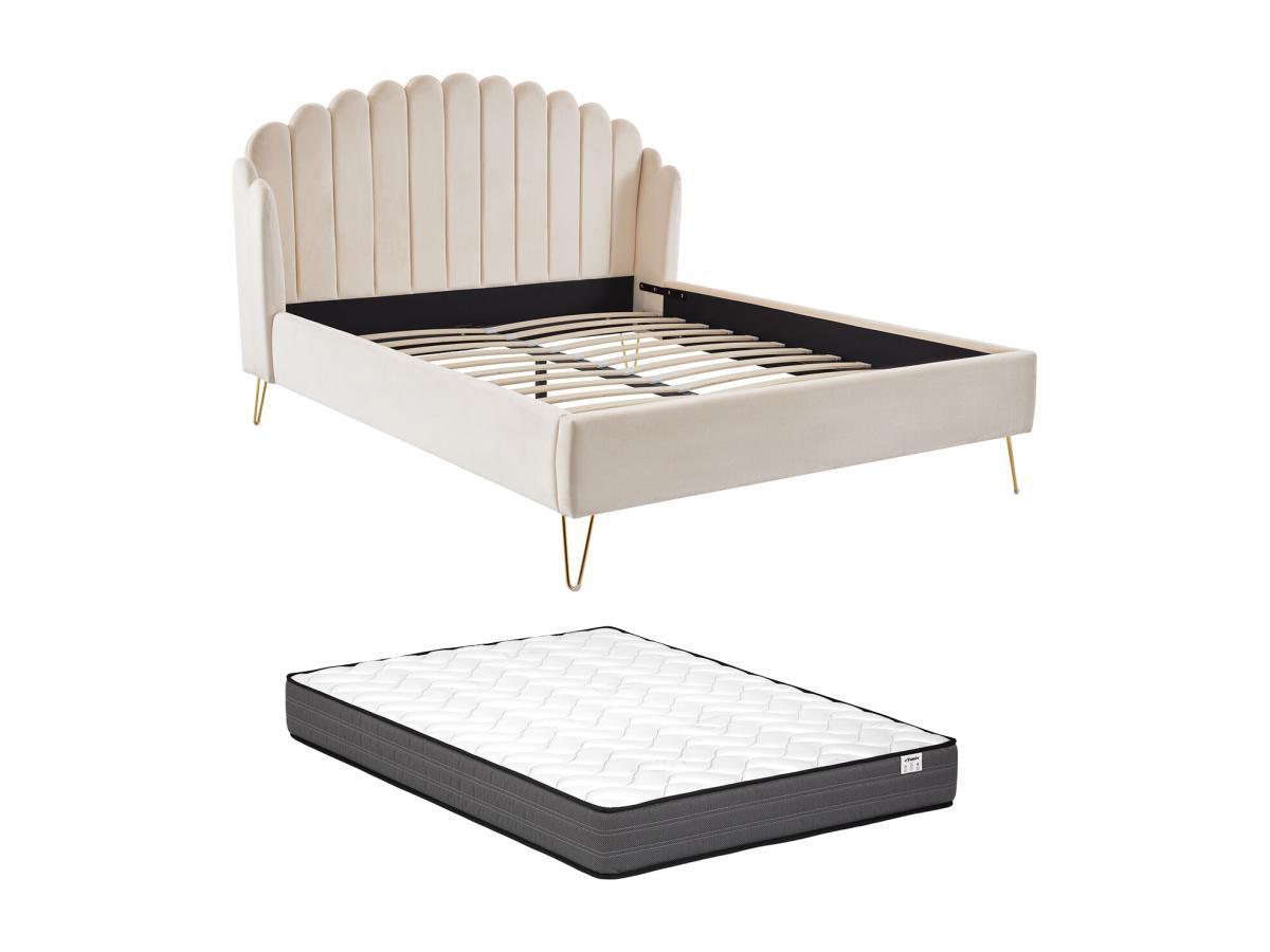 Vente-unique Lit 140 x 190 cm avec tête de lit ondulée - Velours - Beige + Matelas - SAGALI