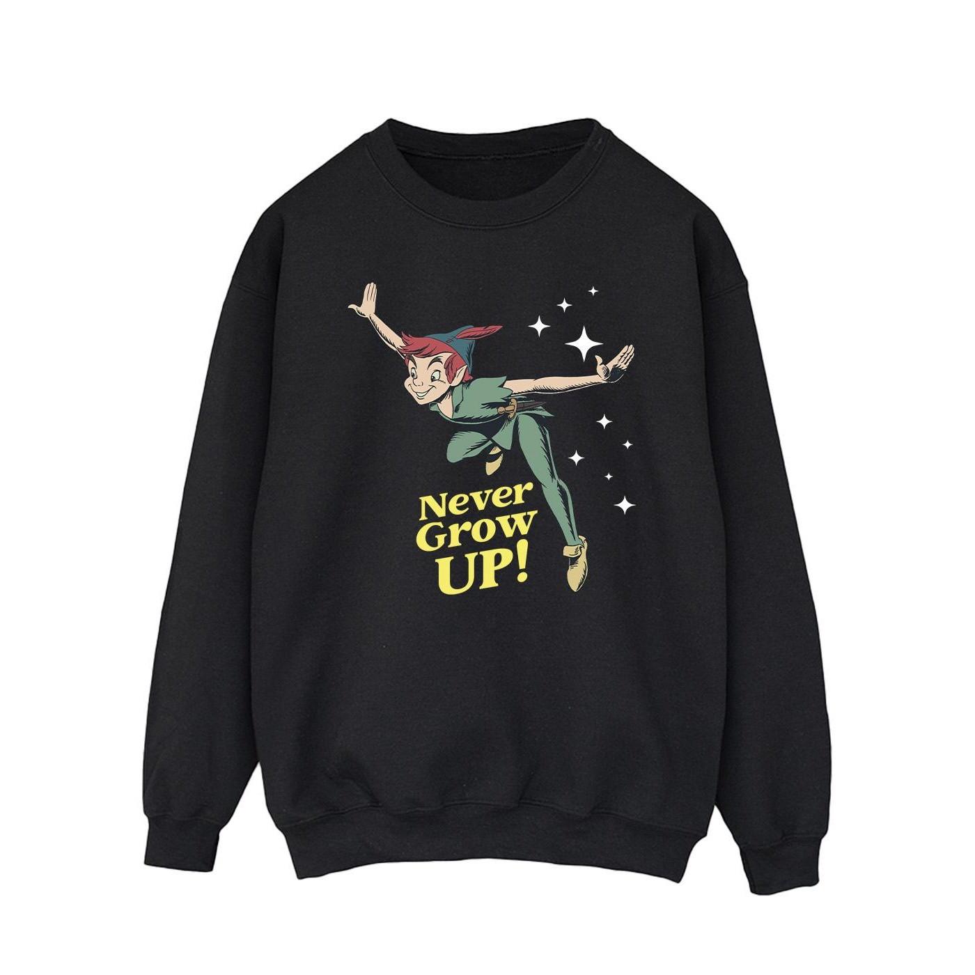 Ce sweat-shirt présente un imprimé graphique ludique de Peter Pan avec la phrase « Never Grow Up! ». Il est conçu pour le confort et une coupe décontractée, ce qui en fait un ajout polyvalent à toute garde-robe décontractée.