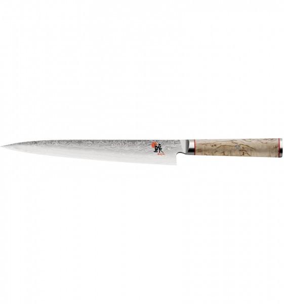 Les couteaux de la série Miyabi 5000MCD sont des outils de précision pour les cuisiniers amateurs et professionnels ambitieux, parfaits en termes de fonction et d'ergonomie et absolument uniques en termes de design. Lame Cryodur de haute qualité (63 HRC) avec un noyau dur en acier en poudre MicroCarbide MC 63, entouré de 100 couches de deux types d'acier différents de dureté différente. Motif damassé de fleurs individuelles, tranchant katana et lame aiguisée double face avec gâchette Honbazuke ultra-tranchante en signe de l'art du couteau le plus magistral. Manche fait du meilleur bouleau de Mazurie avec une épingle en mosaïque et un embout décoratif.