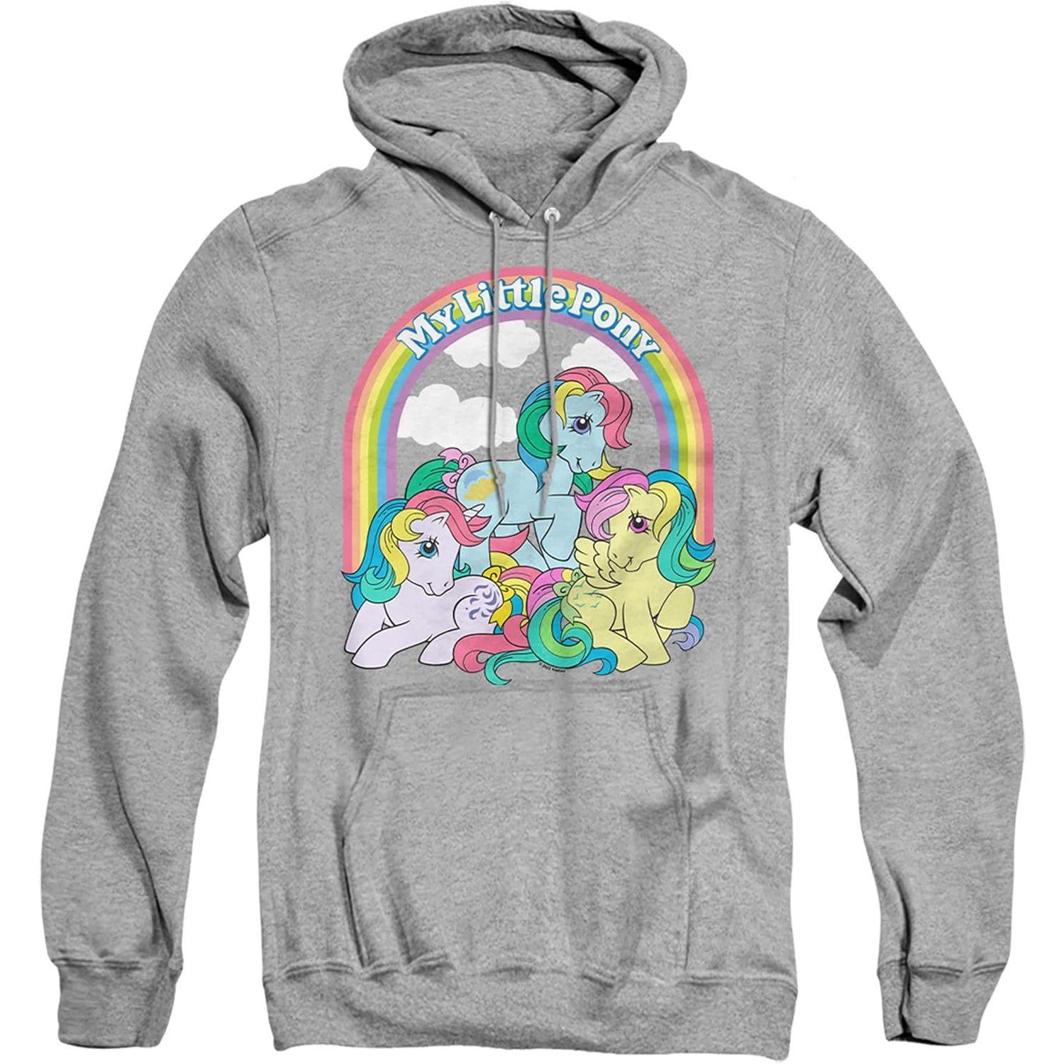 Ce sweat à capuche présente un graphique vibrant des personnages My Little Pony sous un arc-en-ciel, apportant une touche de nostalgie et de couleur à toute garde-robe. Le design est parfait pour les fans de la série animée classique.