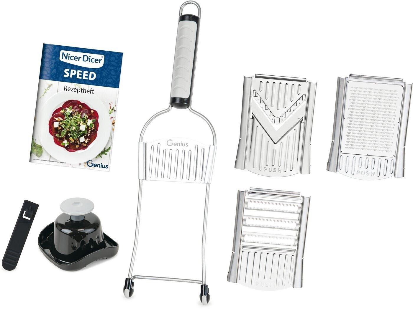 Nice Dicer Speed | coupe-légumes | Ensemble 6 pièces. (A34240) 1 * Cadre 1 rabot multi-lames à 3 lames 1 x insert trancheuse avec julienne 1 x levier (pour retirer les inserts) 1 x porte-tranches 1 * livret de recettes
