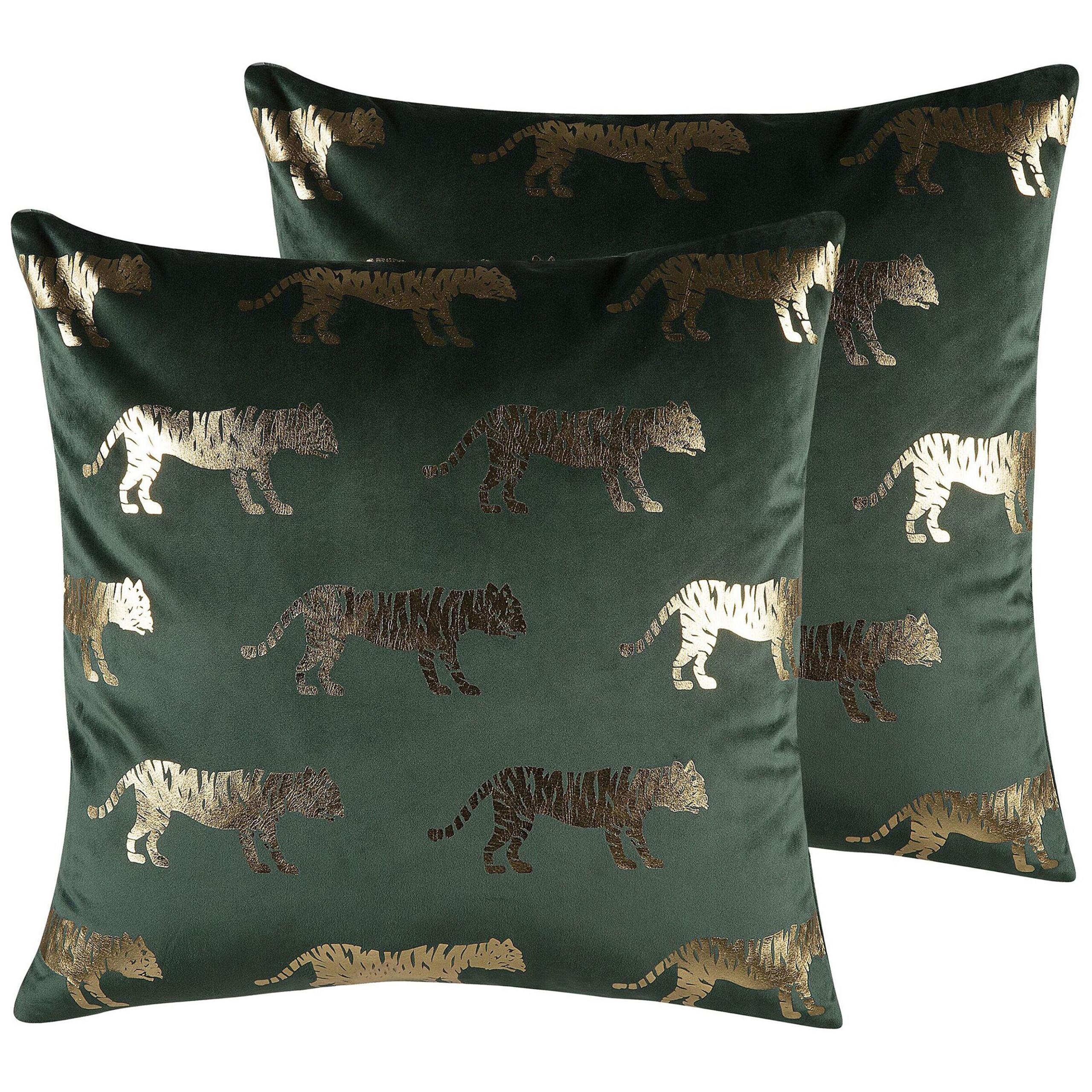 2 coussins décoratifs en velours vert avec motif tigre doré 45 x 45 cm. Apportez une touche de modernité à votre intérieur ! Ce lot de 2 coussins décoratifs en velours vert au motif de tigre doré ajoutera une touche exotique à votre salon ou chambre. Les housses de ces coussins déco sont amovibles, donc si vous désirez changer d'ambiance, il vous suffira juste de retirer les housses et d'enfiler des nouvelles taies.