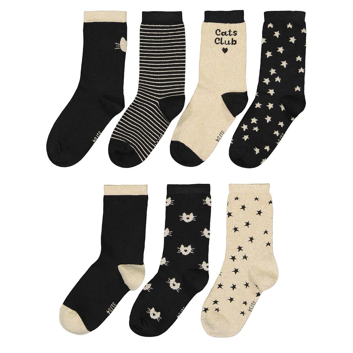Lot de 7 paires de chaussettes fantaisie : 1 unie + 1 unie avec motif chat au dos + 1 rayée + 1 motif chats + 2 motif étoiles + 1 avec texte cats club sur le côté
