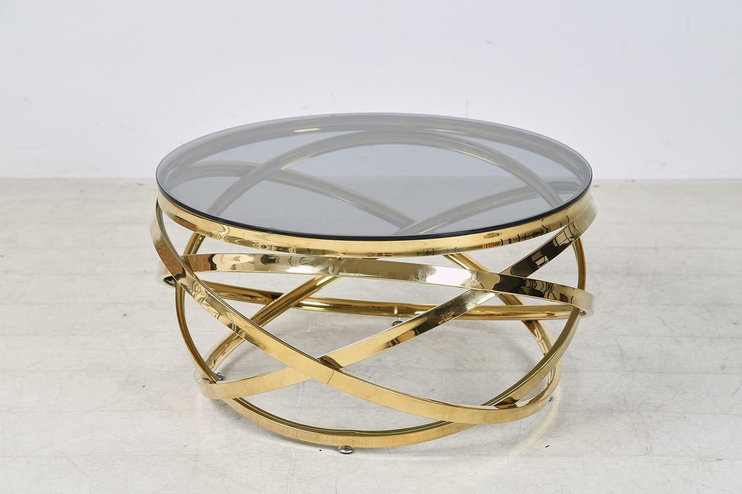Si vous êtes à la recherche d'un objet au design extravagant et hors du commun, cette table basse ronde en verre de sécurité et en acier inoxydable robuste est le bon choix. Le cadre abstrait en acier inoxydable fait de cette table en verre un objet très particulier qui rehausse en un clin d'œil le luxe de tout salon ou coin salon. Les tables basses et les tables d'appoint rondes s'accordent particulièrement bien avec les canapés et les fauteuils cubiques. Le plateau de table est en verre de sécurité de 8 mm d'épaisseur et, associé au piètement en acier inoxydable, il forme une combinaison particulièrement facile à entretenir et résistante. Le beau piètement doré attirera dans tous les cas l'attention comme pièce maîtresse devant le canapé.avec piétement design en acier inoxydableplateau de table en verre de sécurité grispiètement laqué en acier inoxydable doréépaisseur du plateau : 8 mm