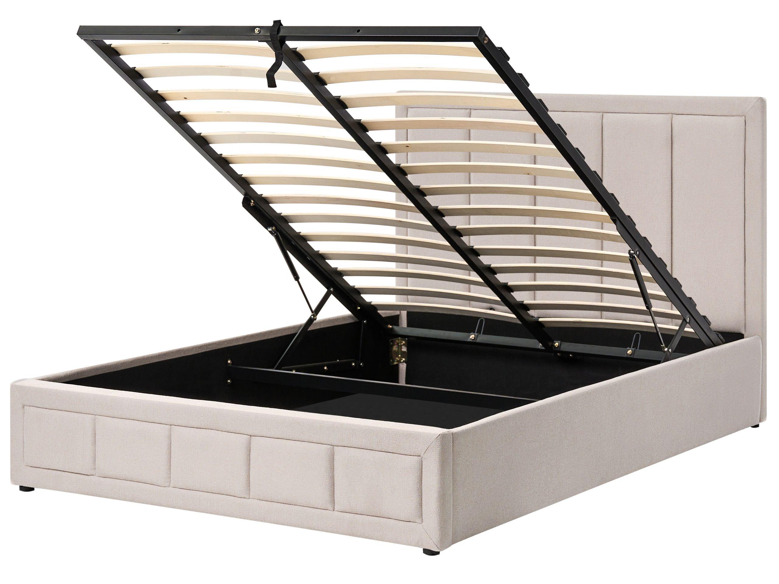 Lit avec rangement et tête de lit. Ce lit de rangement minimaliste allie style et fonctionnalité, avec un revêtement en tissu durable et facile d'entretien. Le sommier à lattes relevable offre un soutien adéquat du corps et un espace de rangement pratique pour la literie, tandis que la tête de lit matelassée apporte un confort supplémentaire. Sa teinte neutre en fait un choix polyvalent qui s'adapte à tous les styles de décoration de chambre à coucher.