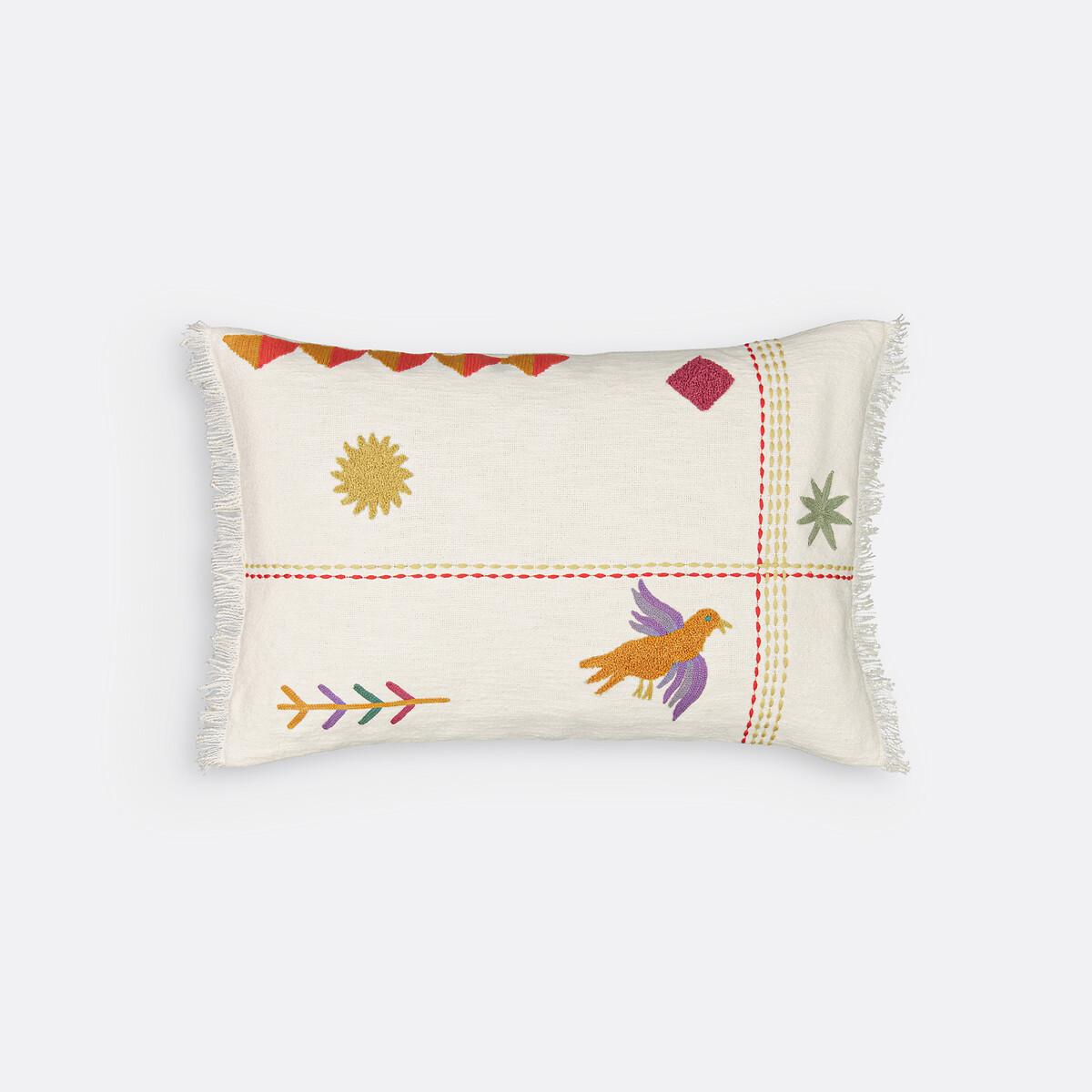 La housse de coussin Alvarao présente un motif coloré inspiré des cultures d'Amérique centrale et des bords frangés. Brodé en point de chaînette et bouclette, il apporte une touche d'évasion à tout salon ou chambre à coucher.