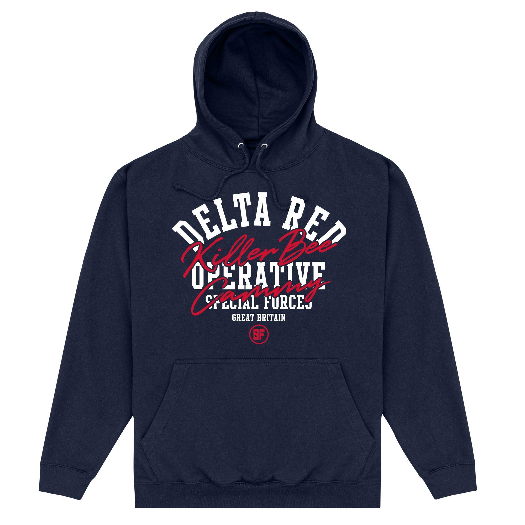 Ce sweat à capuche présente un imprimé graphique audacieux sur le devant, affichant « DELTA RED Killer Bee OPERATIVE SPECIAL FORCE GREAT BRITAIN » avec un emblème « SF ». Le design est mis en évidence sur un fond uni, ce qui en fait une pièce distinctive.