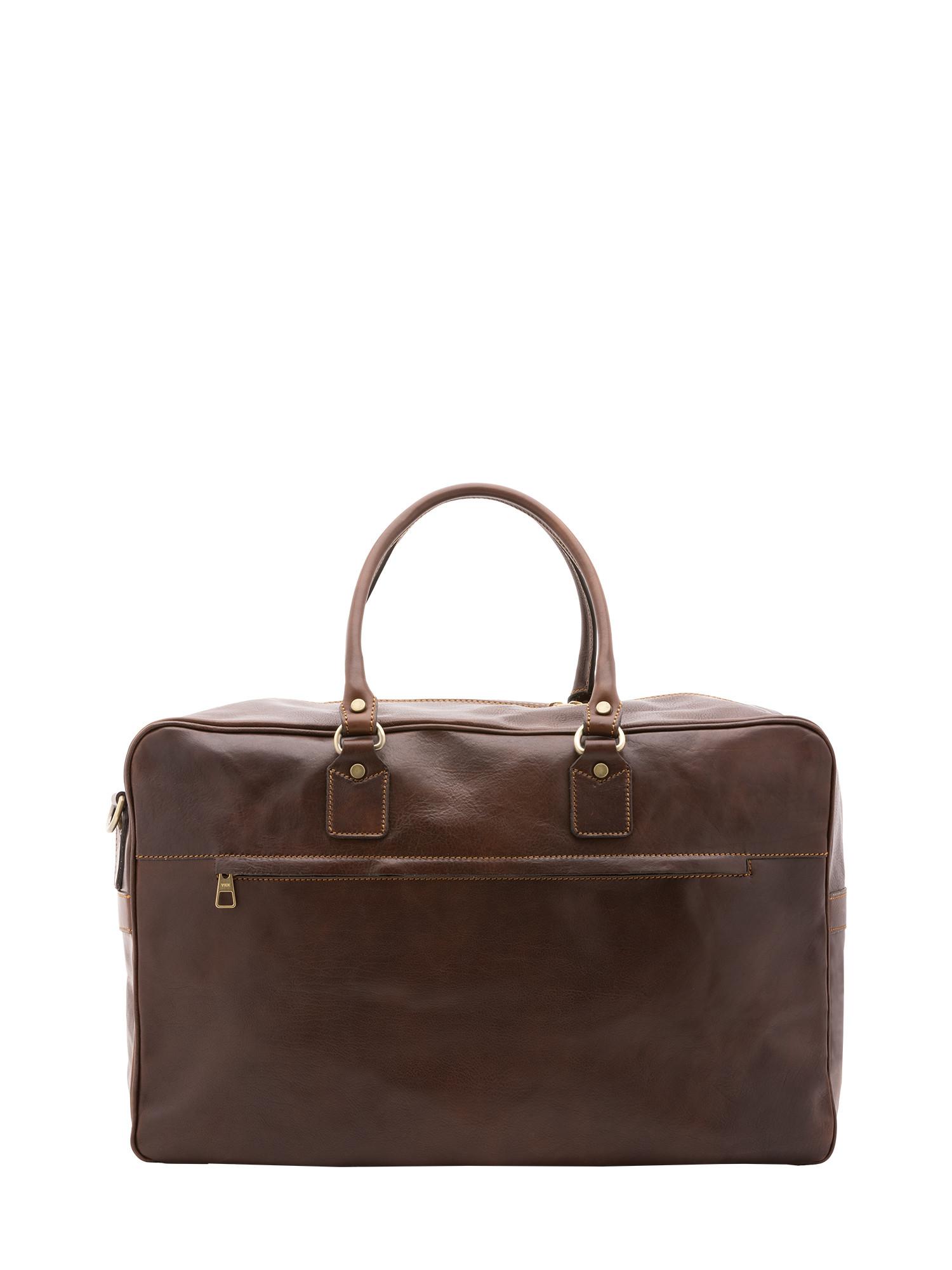 Sac de voyage unisexe. La fermeture est avec zip. Les poches intérieures sont une avec fermeture éclair. Les poches extérieures sont une devant avec fermeture éclair et une arrière avec fermeture éclair. La bandoulière est réglable et amovible en cuir. La poignée est en cuir. Il y a un compartiment interne. Le matériau extérieur est 100 % cuir véritable. À l'intérieur, il est doublé de coton. Dimensions : 53x46x23 cm. Fabriqué en Italie